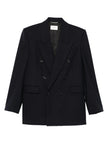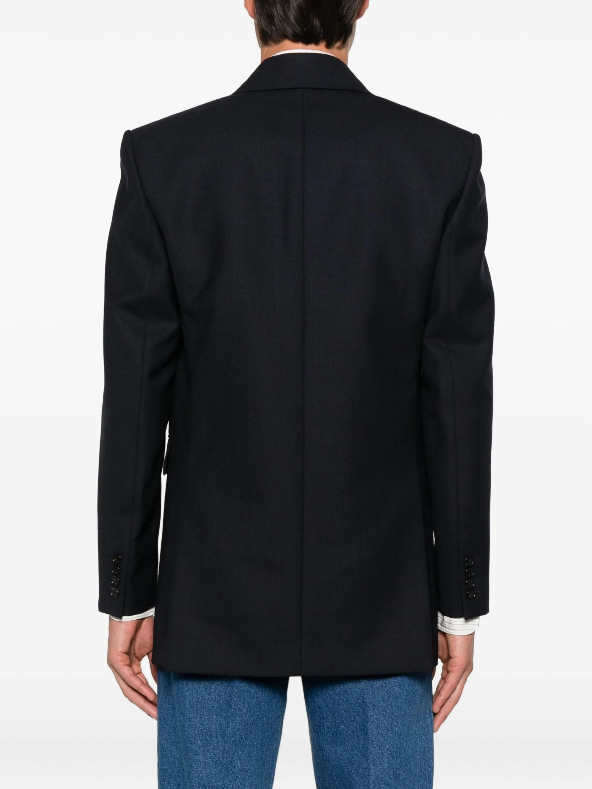 dark blue double-breasted closure peak lapels long sleeves flap pockets straight hemline