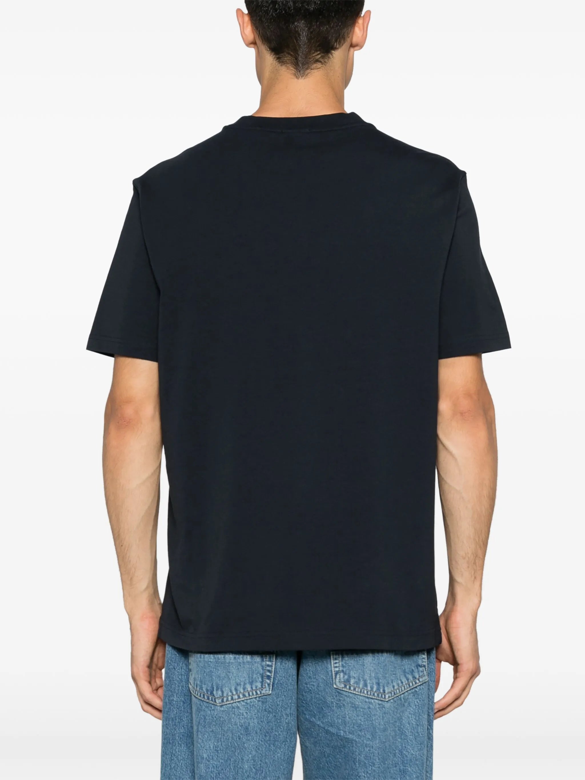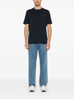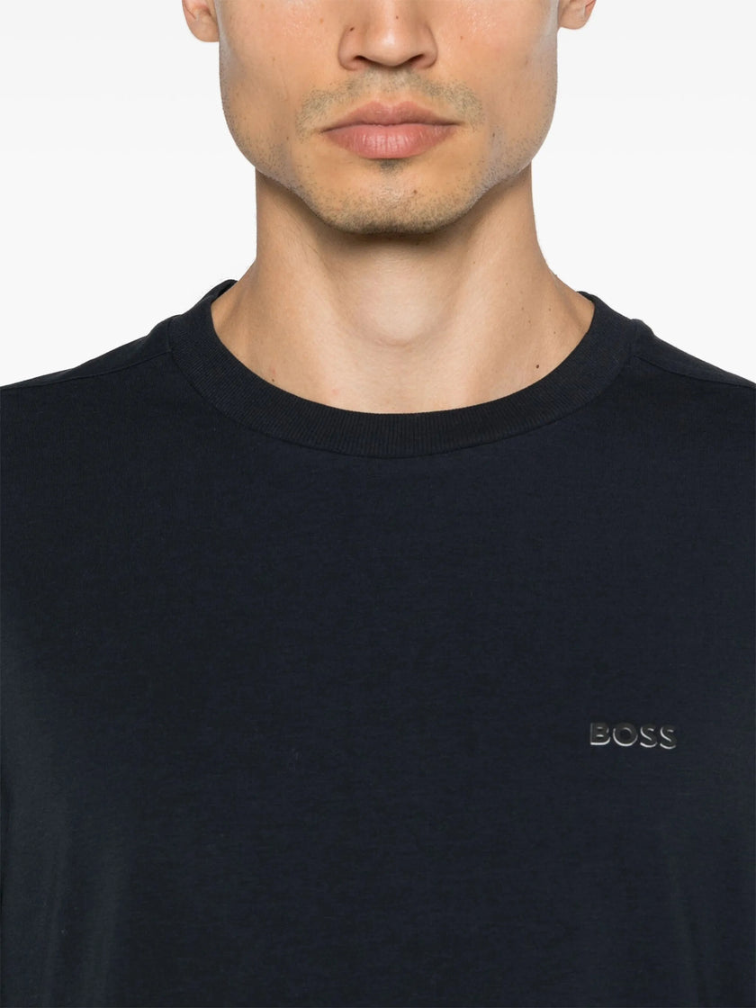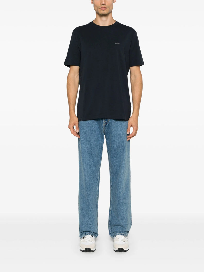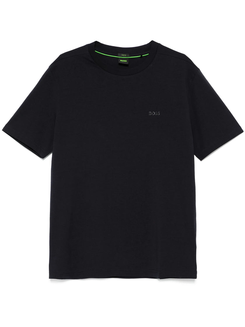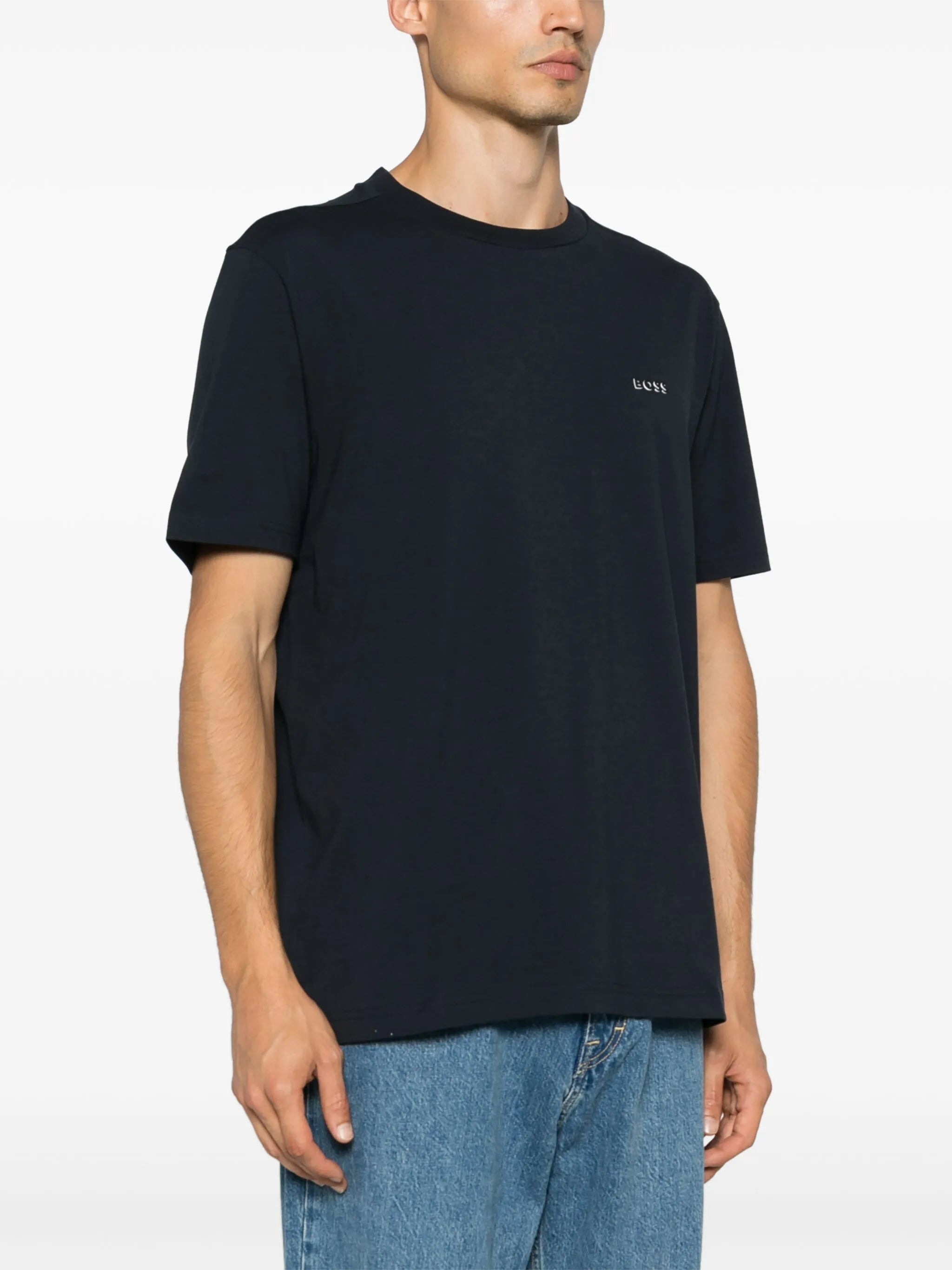navy blue cotton jersey texture round neck short sleeves embossed logo to the front straight hem