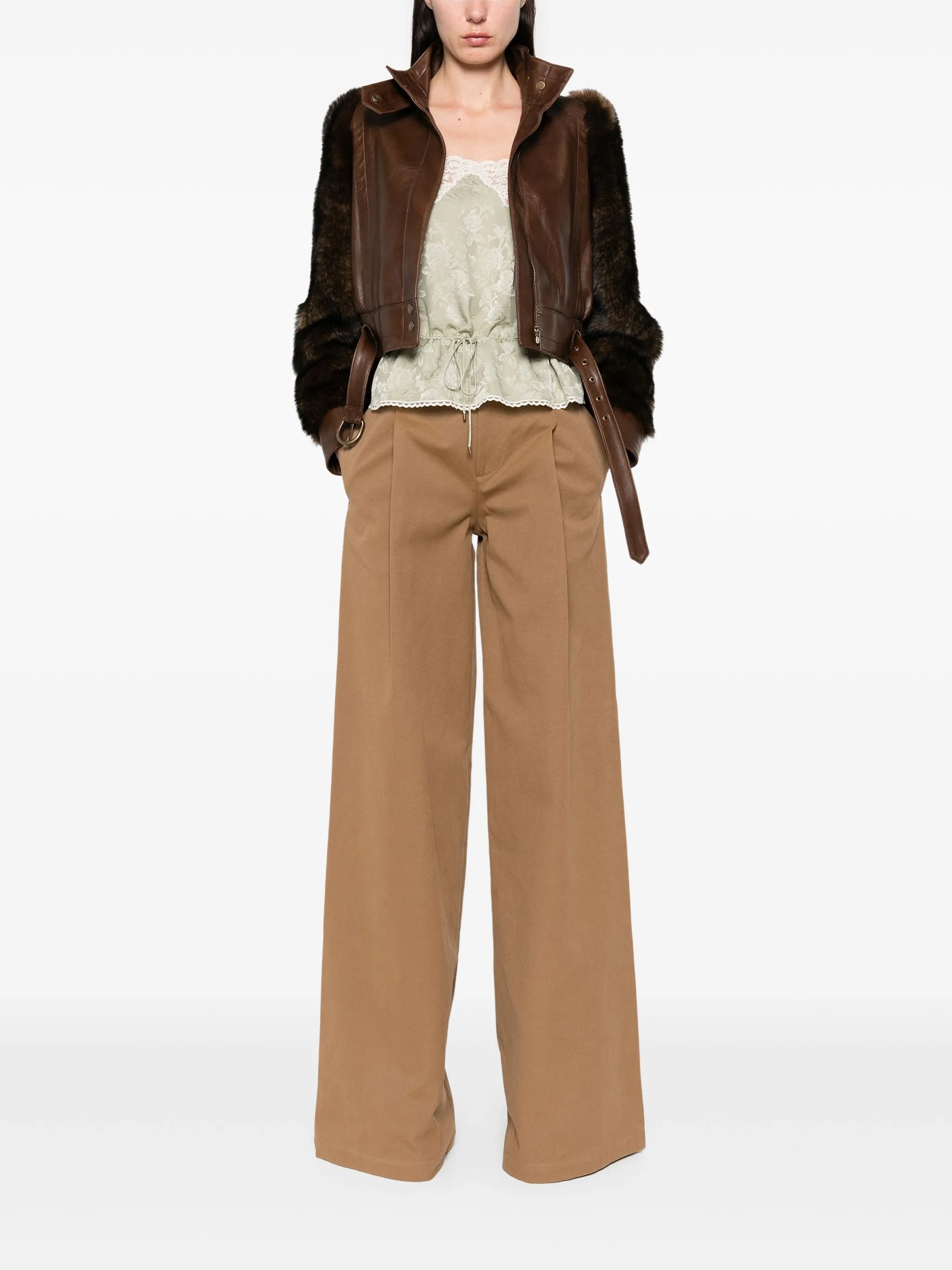 walnut brown front press-stud and zip fastening detachable and adjustable waist belt two side welt pockets fur detailing