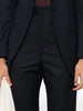 navy blue front button fastening chest welt pocket two side flap pockets central rear vent