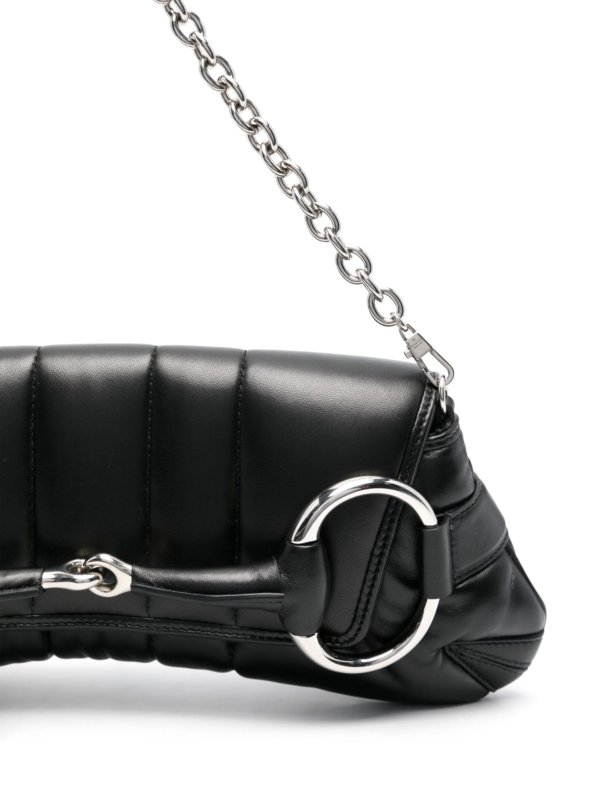 black calf leather quilted signature Horsebit detail foldover top with magnetic fastening two detachable leather and chain-link shoulder straps satin lining internal logo patch internal slip pocket main compartment silver-tone hardware This piece comes complete with a protective dust bag.