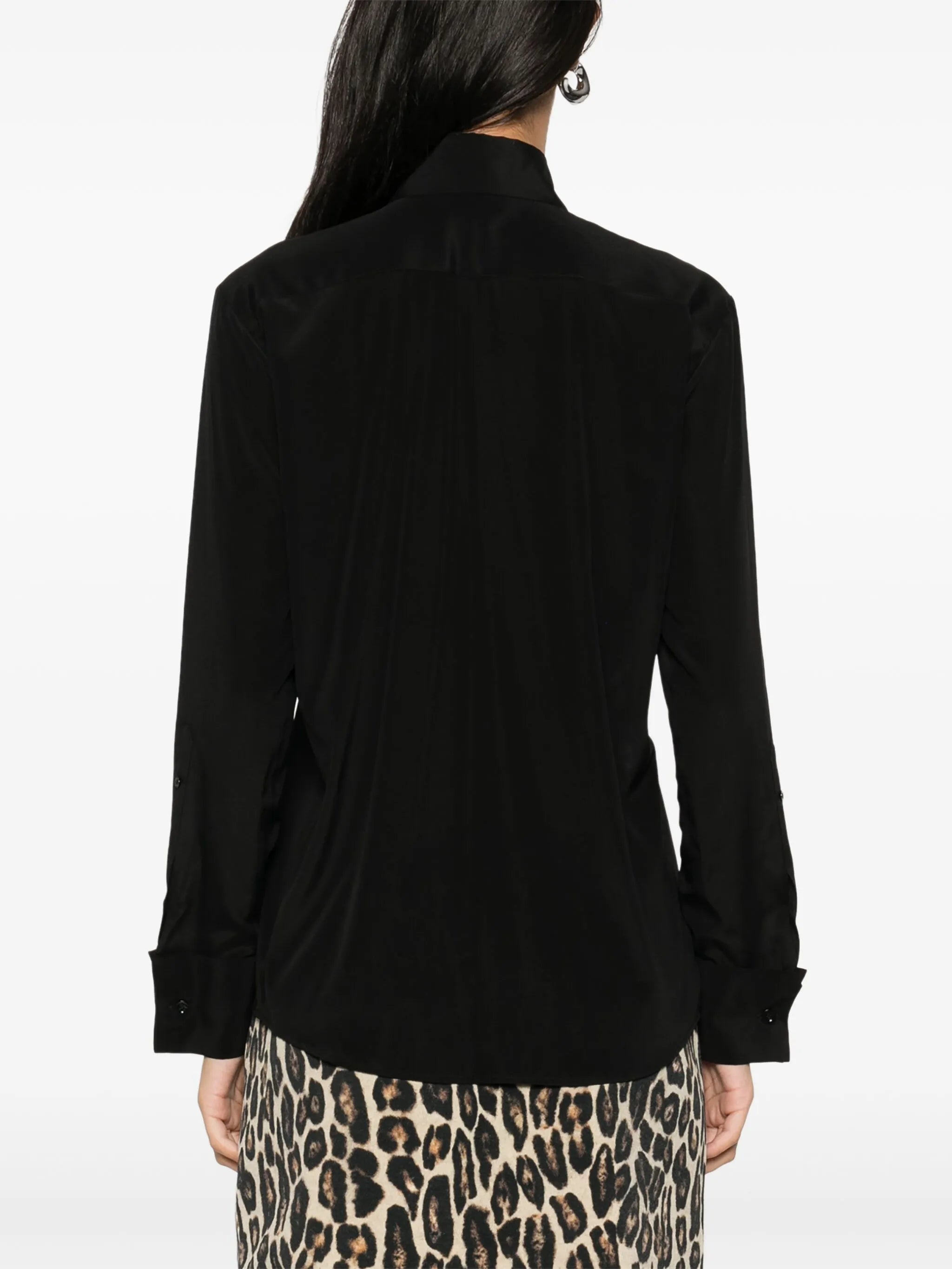 black silk blend georgette crepe front button fastening classic collar long sleeves with buttoned cuffs two chest flap pockets rear curved hem