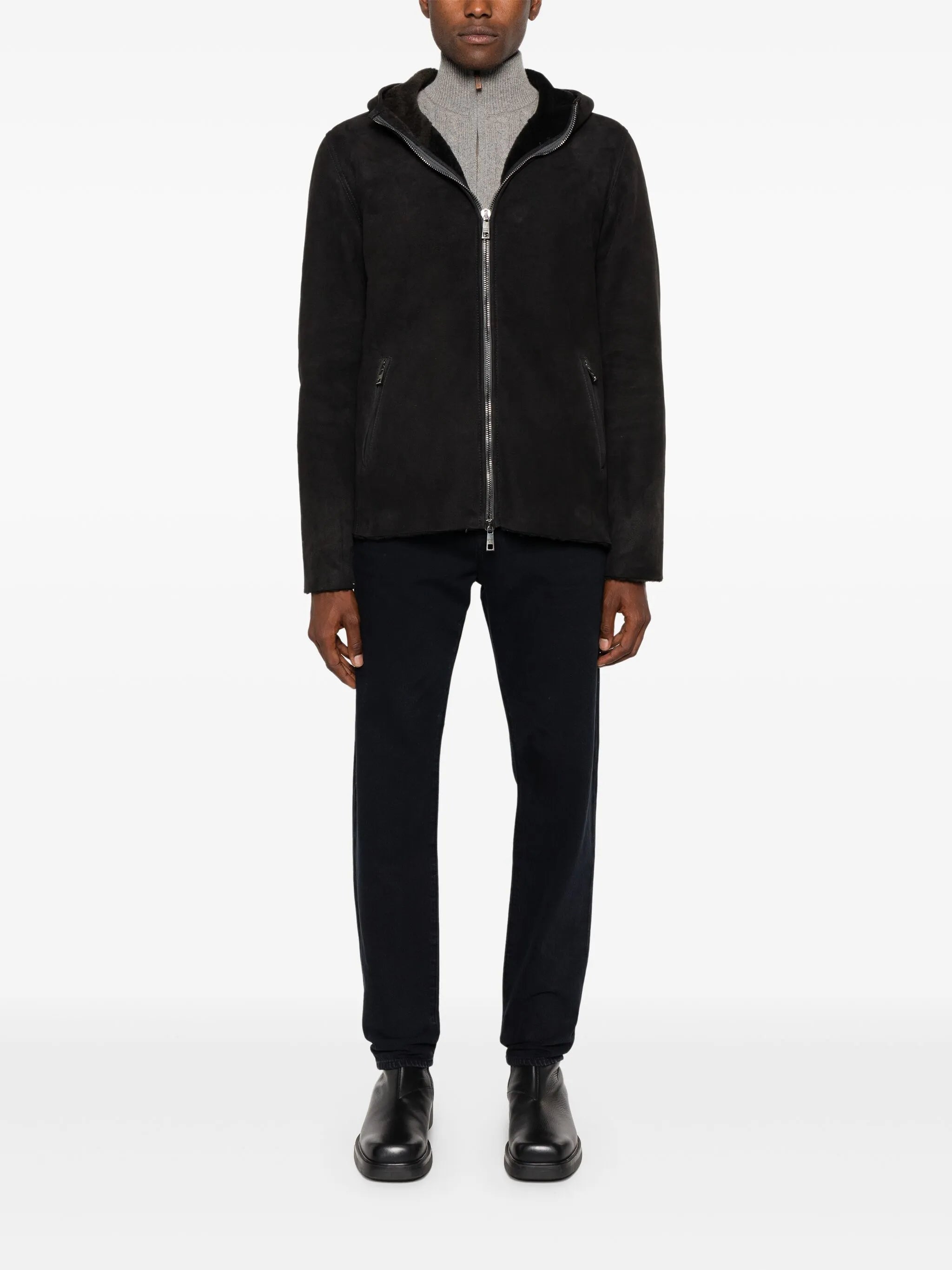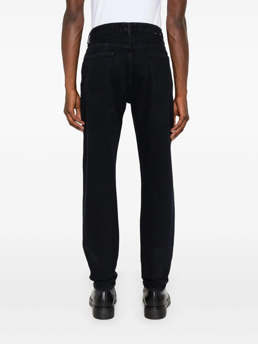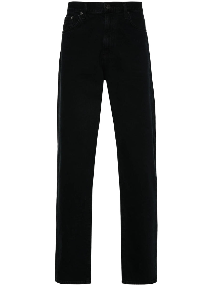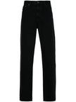 black cotton denim mid-rise belt loops classic five pockets straight leg concealed fly and button fastening