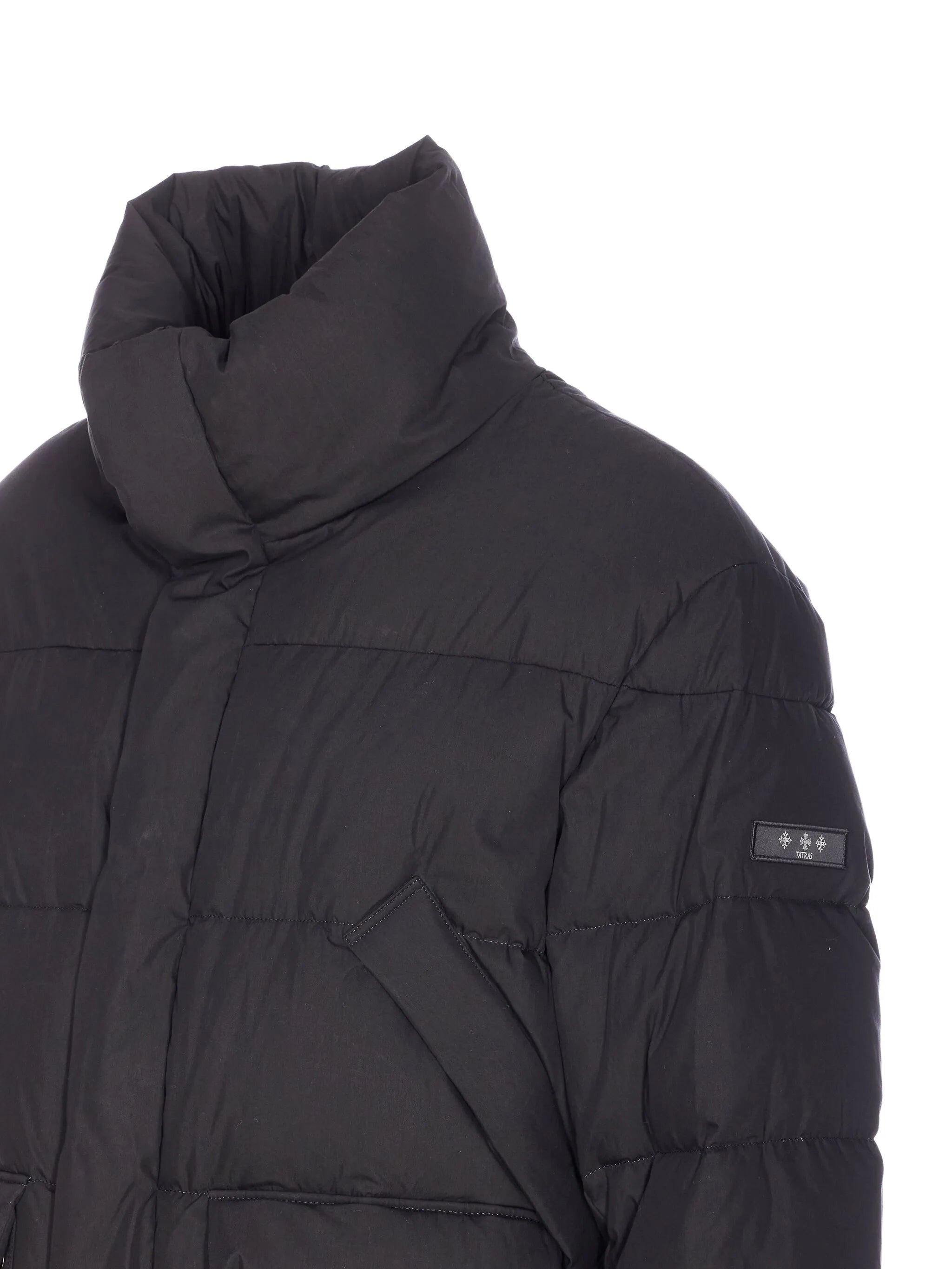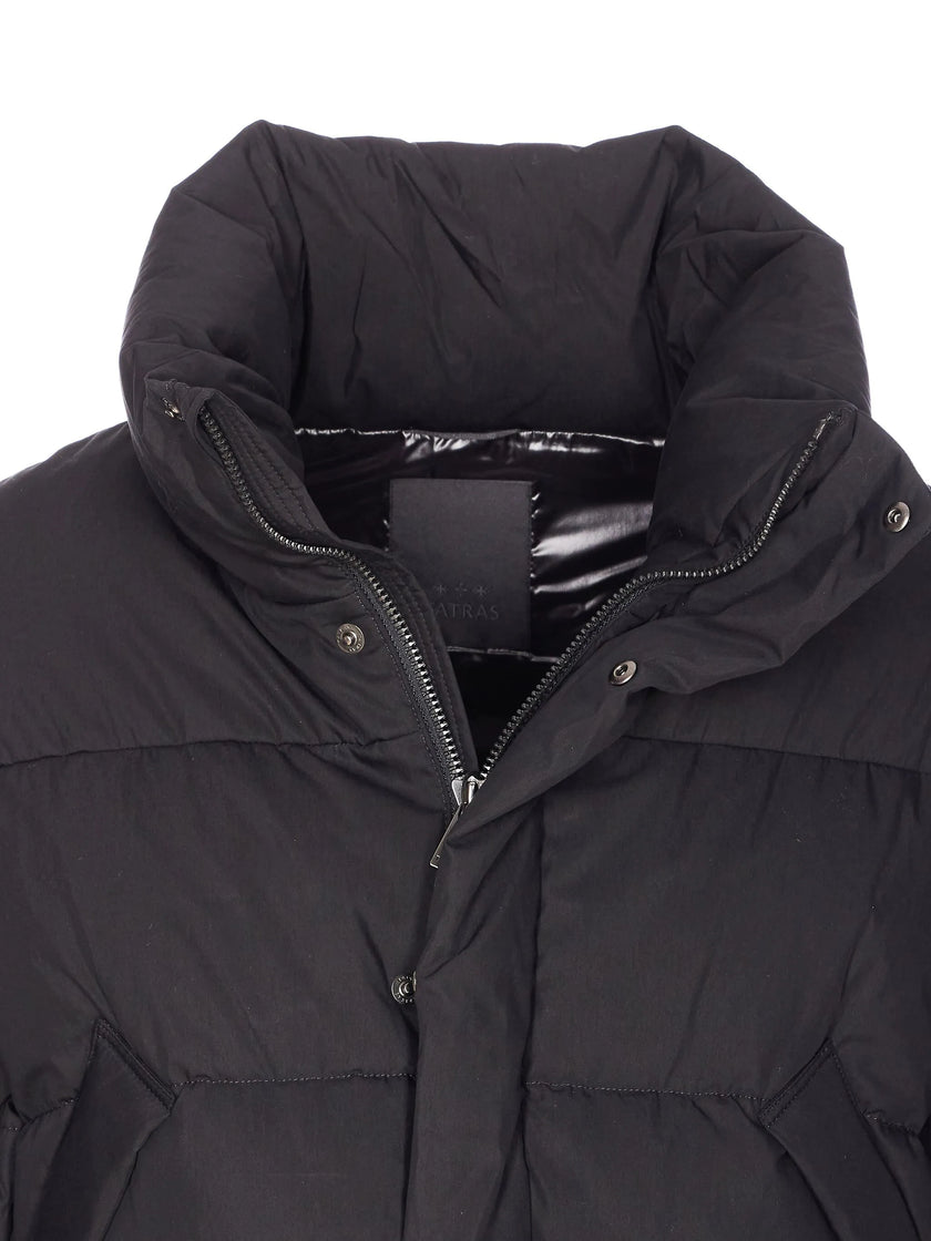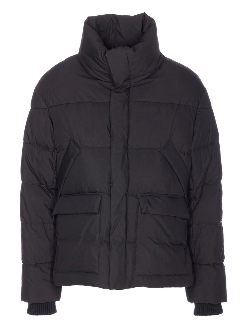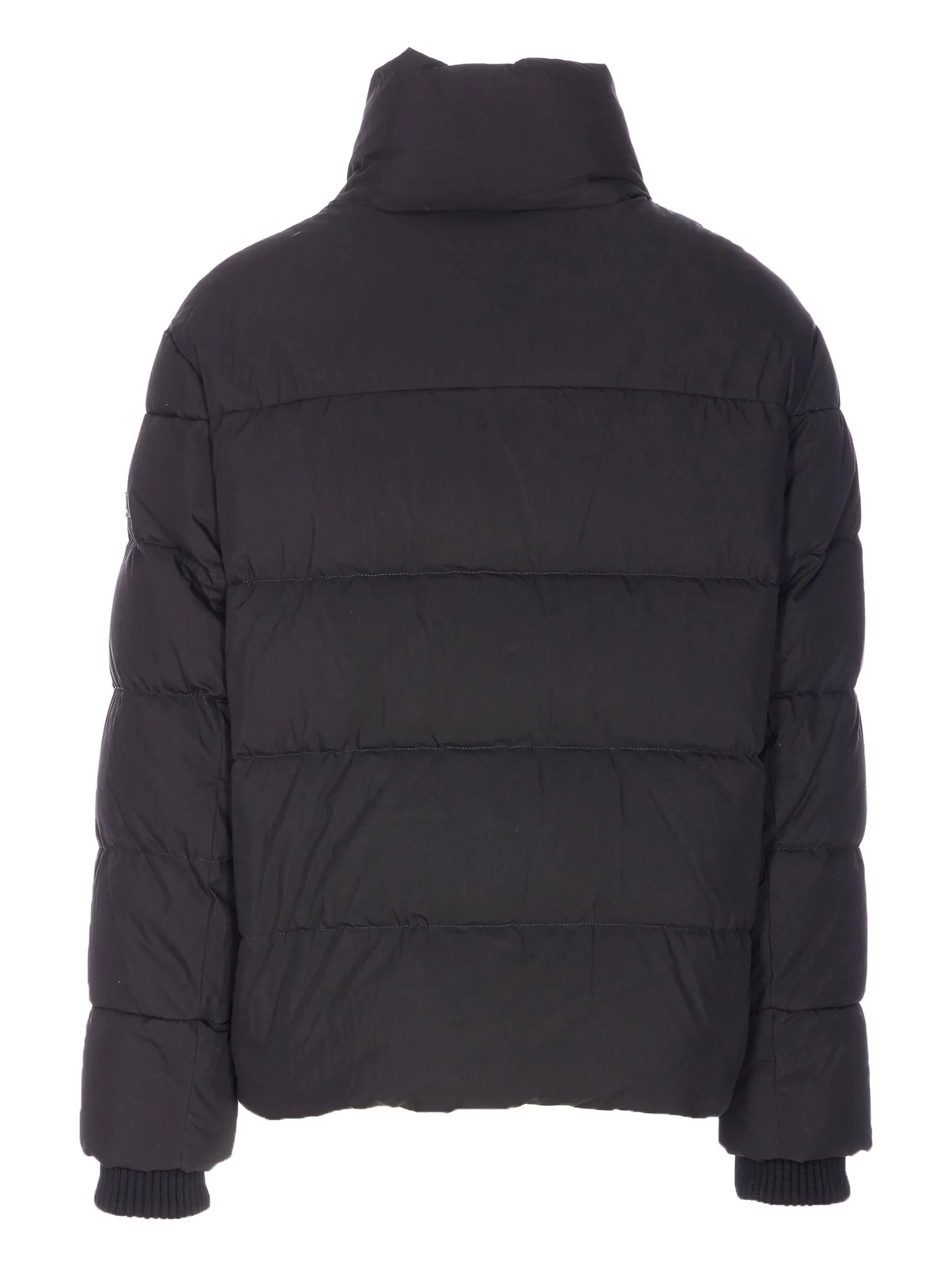 black concealed zip closure high neck long sleeves lateral patch logo front flap pockets