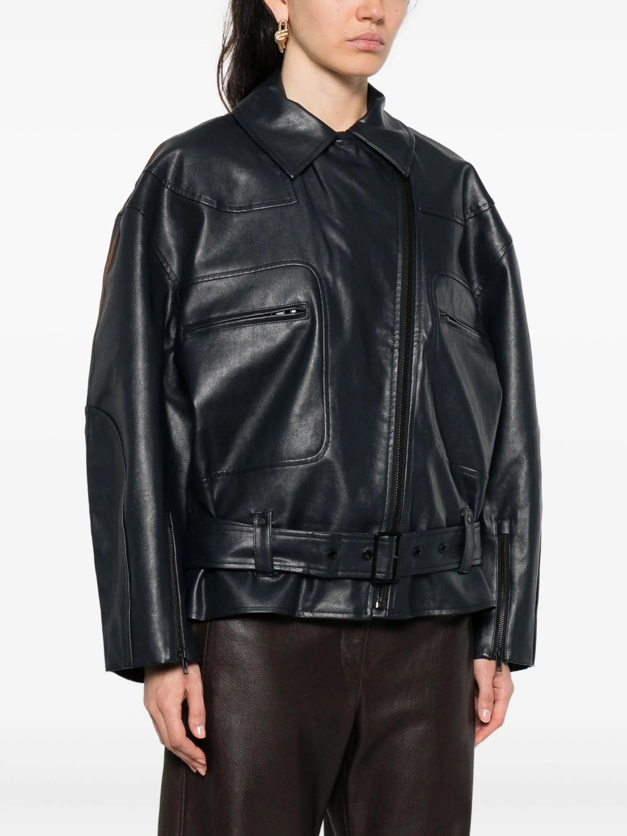 dark blue leather effect belted waist zip fastening stripe panel detail zip pockets