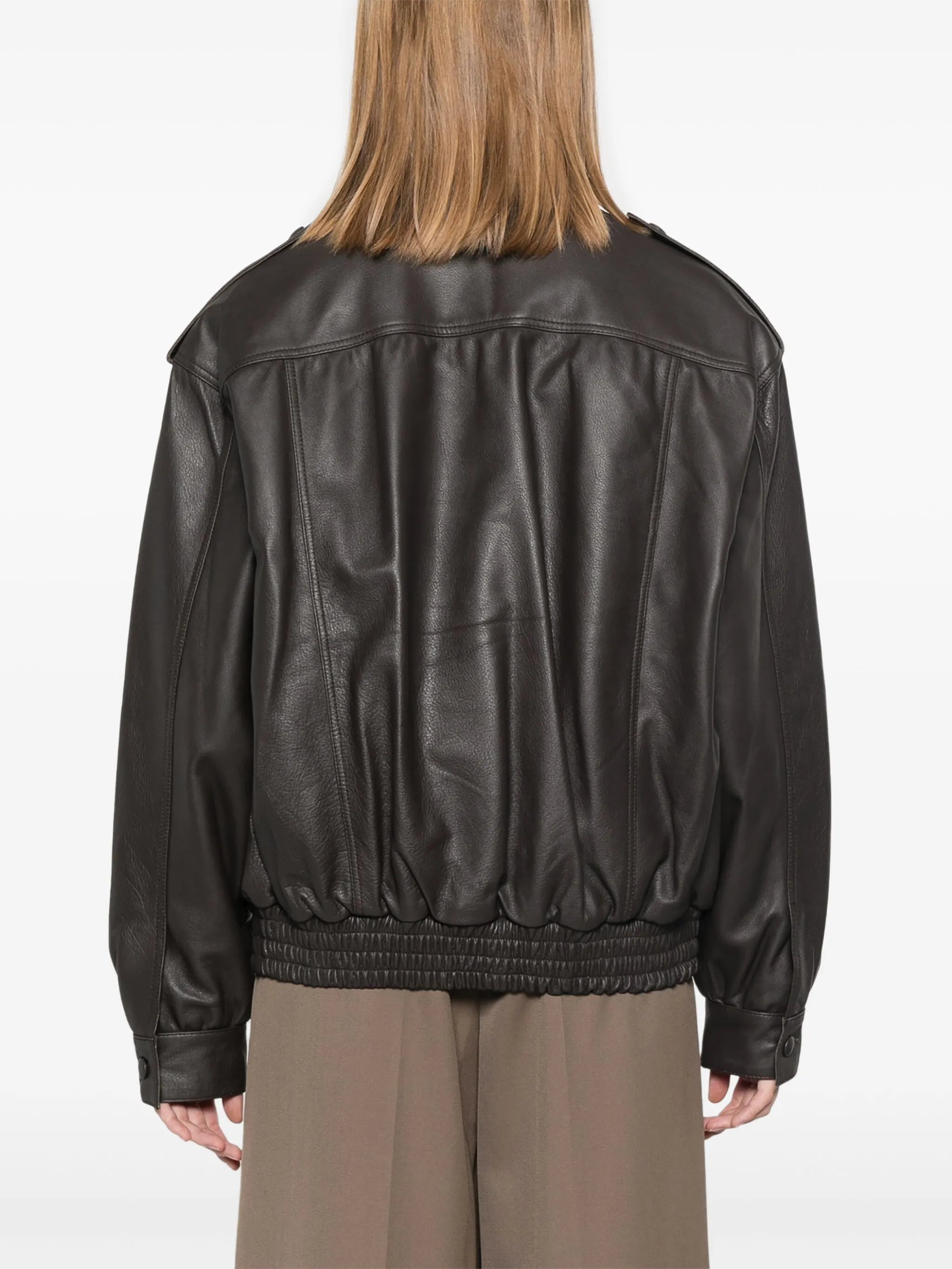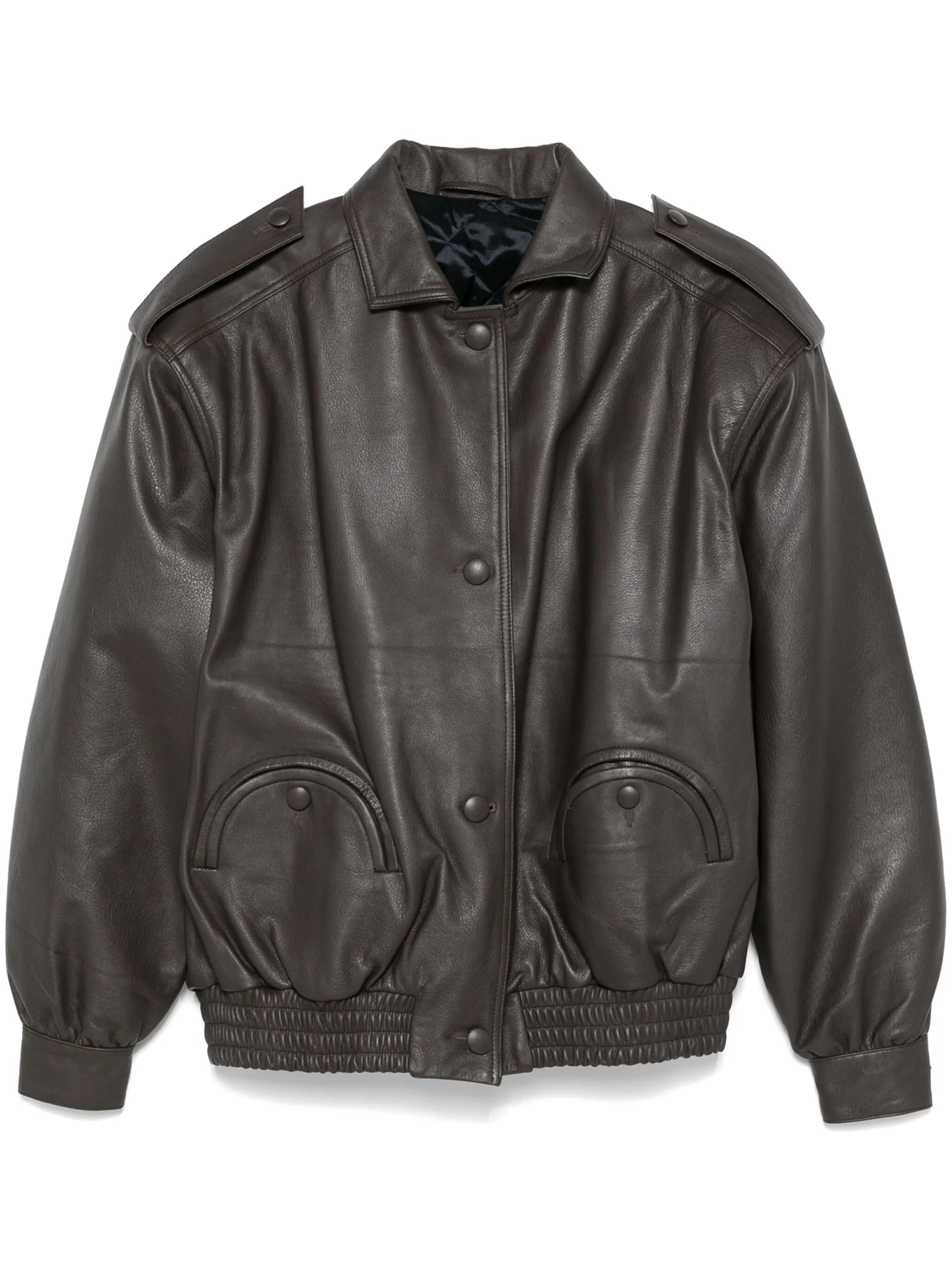 cedar brown calf leather smooth grain front button fastening classic collar epaulettes long sleeves buttoned cuffs two front button-fastening jetted pockets internal jetted pocket diamond-quilted lining elasticated hem