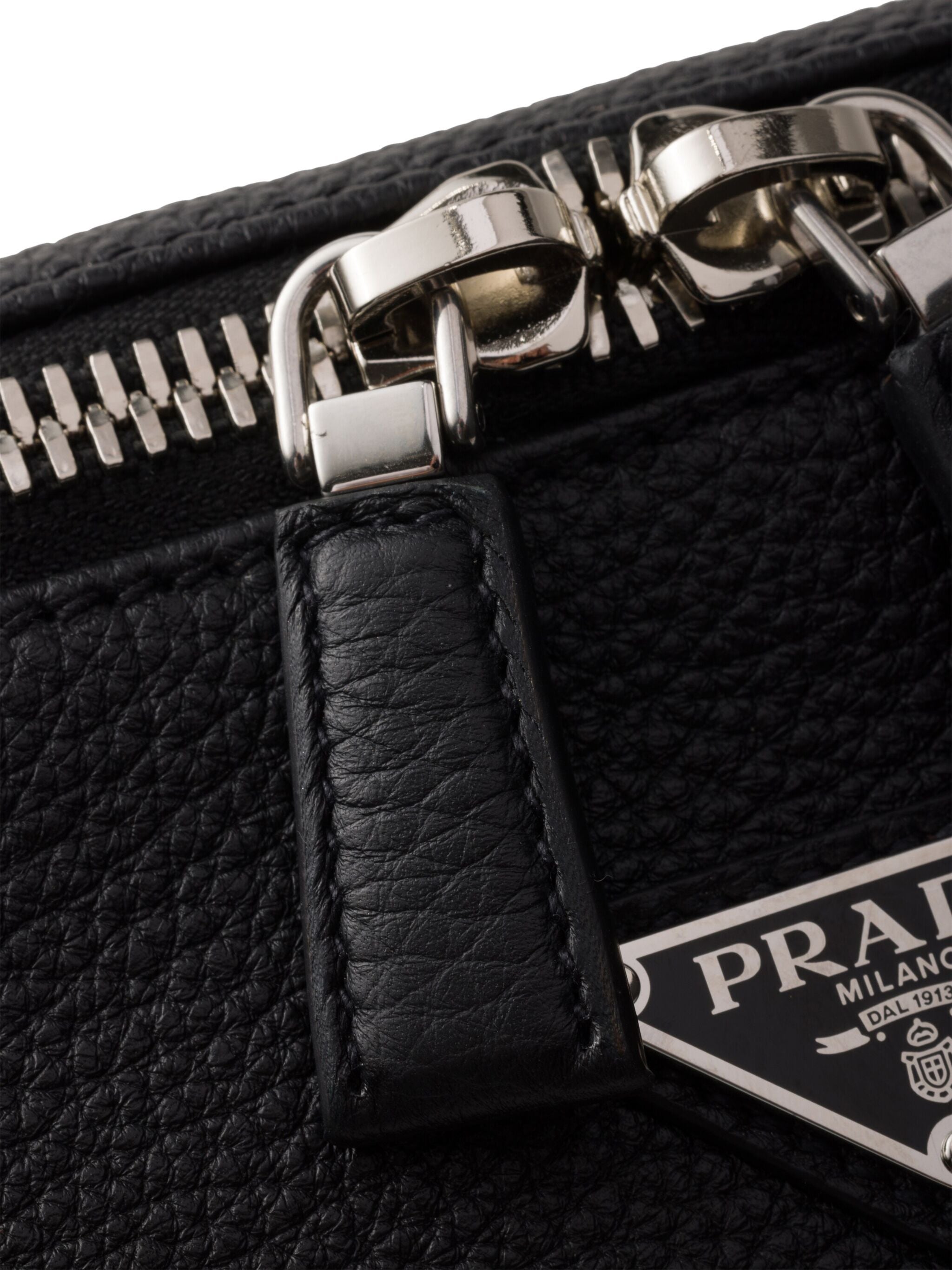 black leather pebbled texture two-way zip fastening adjustable shoulder strap enamel triangle logo main compartment internal zip-fastening pocket internal logo plaque