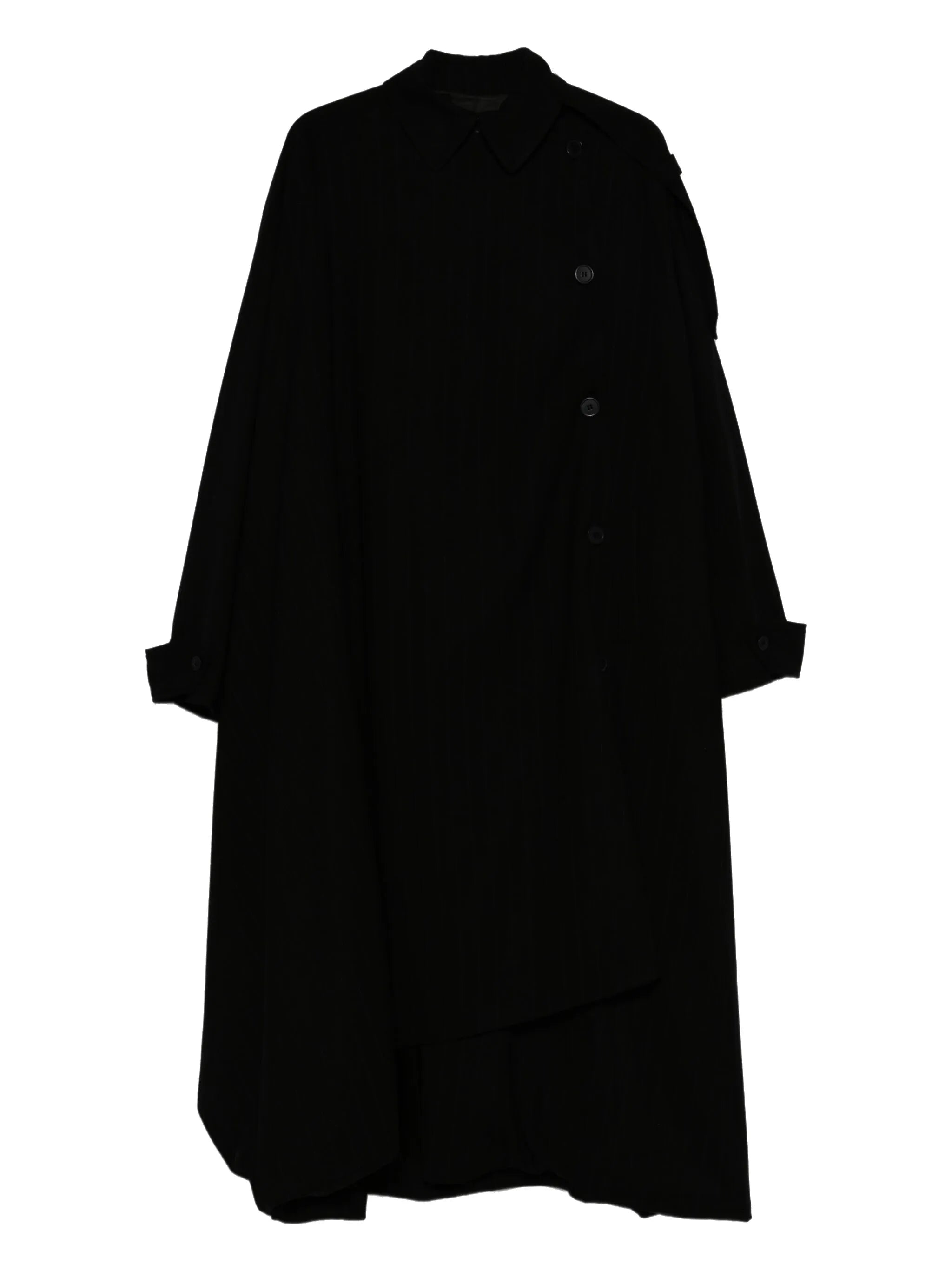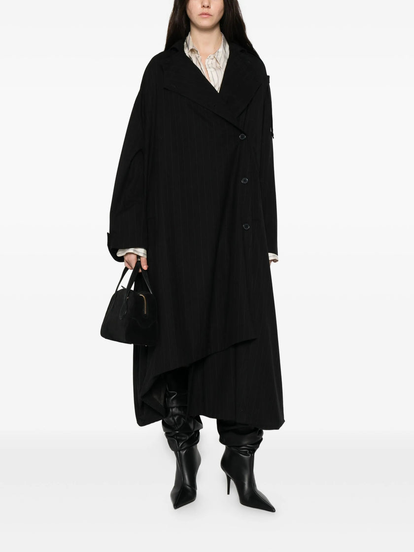 black pinstripe pattern off-centre button fastening asymmetric hem epaulettes buttoned cuffs