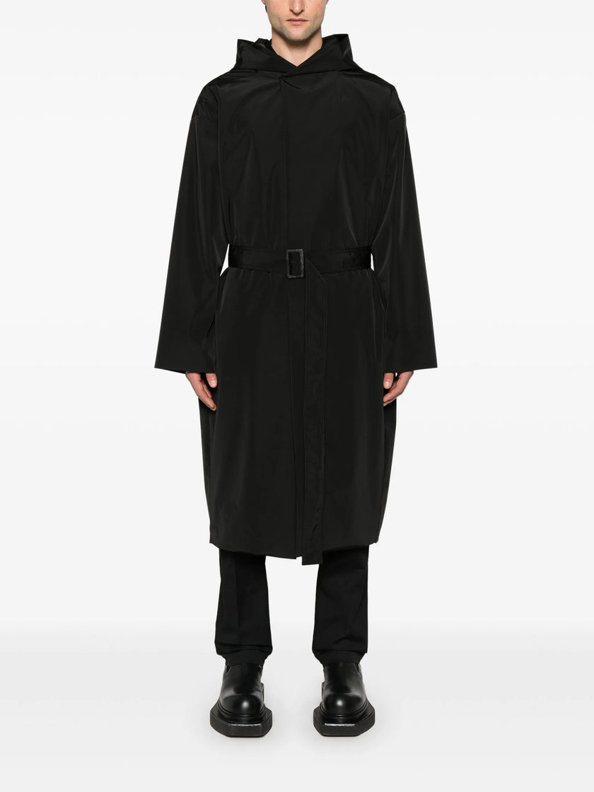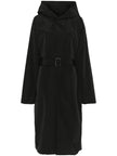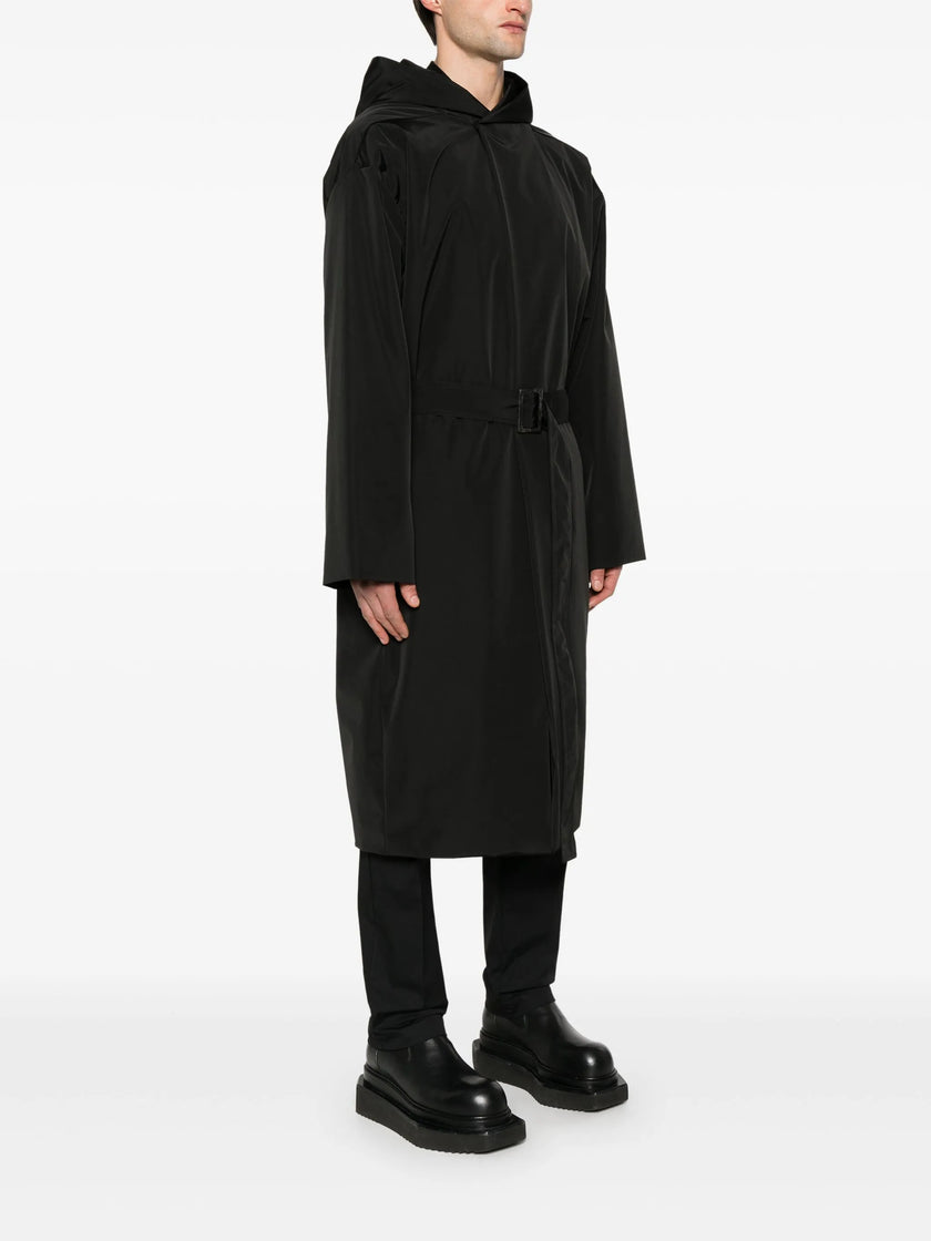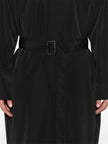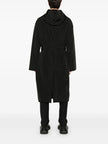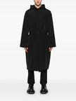 black concealed front press-stud fastening two side inset pockets central rear vent long sleeves