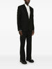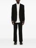 black twill weave pinstripe pattern Blazer front button fastening fringe detailing layered details peak lapels long sleeves split cuffs two front jetted pockets central rear vent full lining internal slip pocket straight hem Trousers concealed front button, hook and zip fastening belt loops pressed crease two diagonal pockets to the sides two rear jetted pockets tapered leg