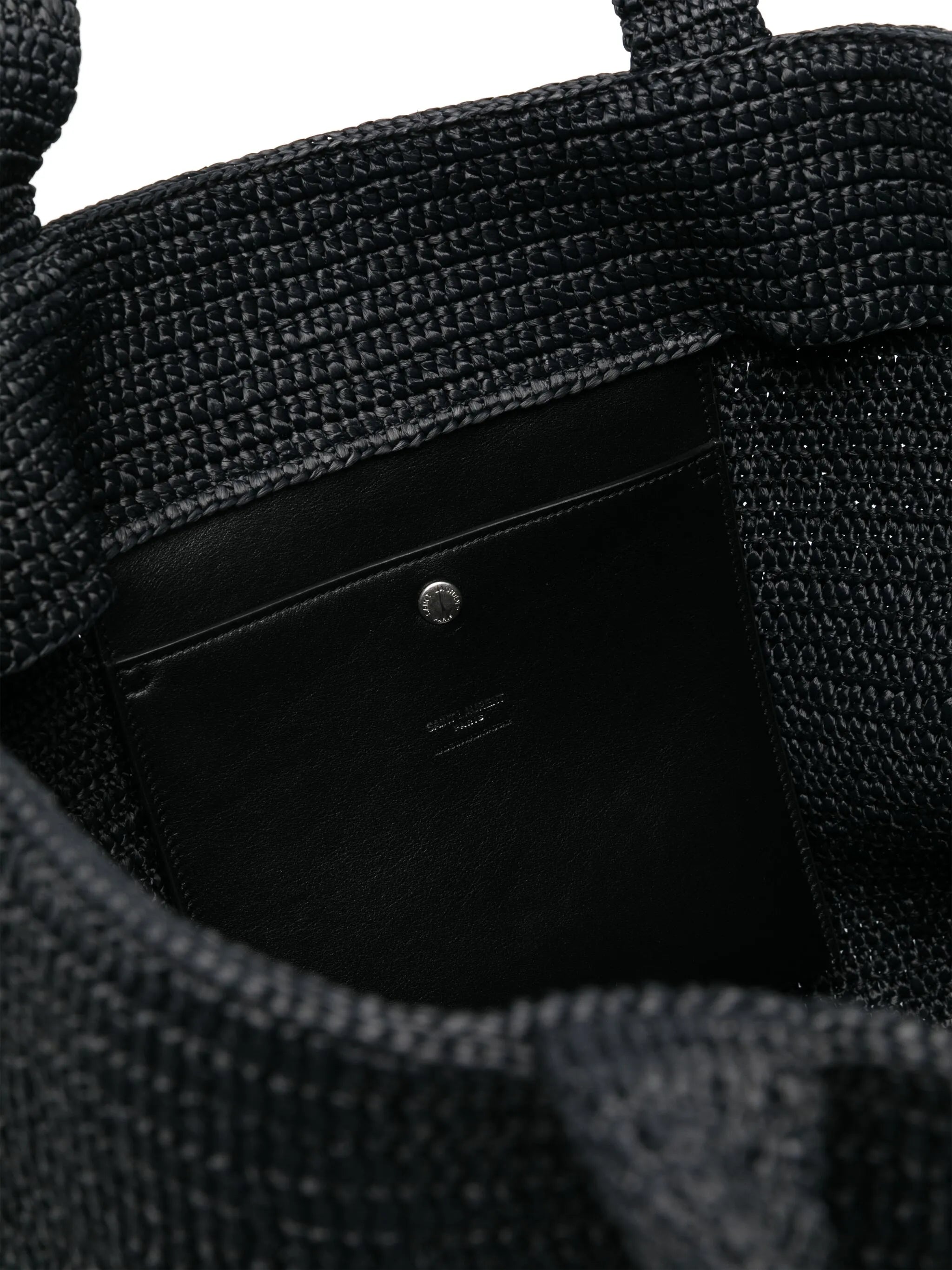 black woven raffia design embossed logo to the front two flat top handles main compartment internal patch pocket internal logo stamp This piece comes complete with a protective dust bag.