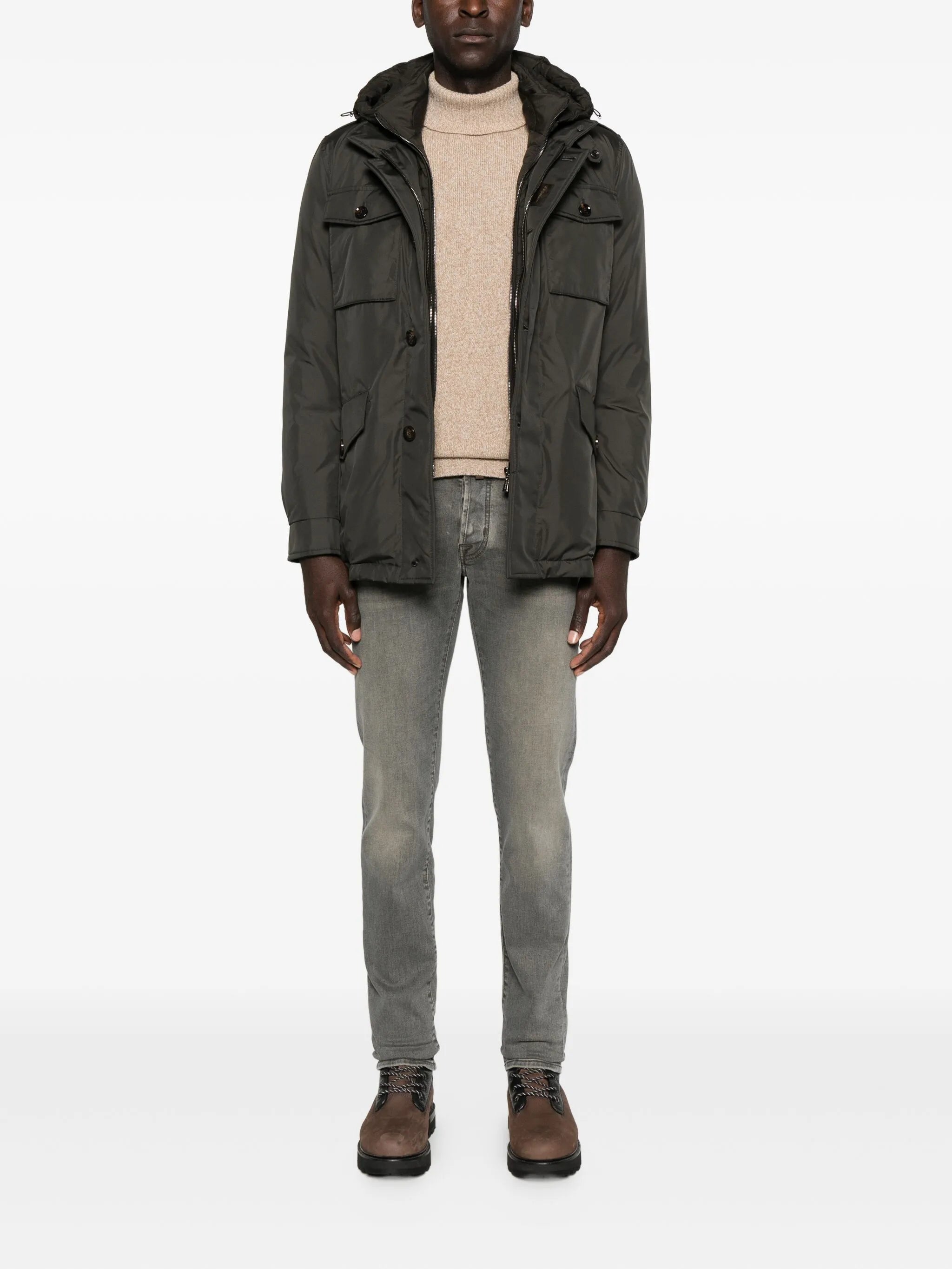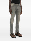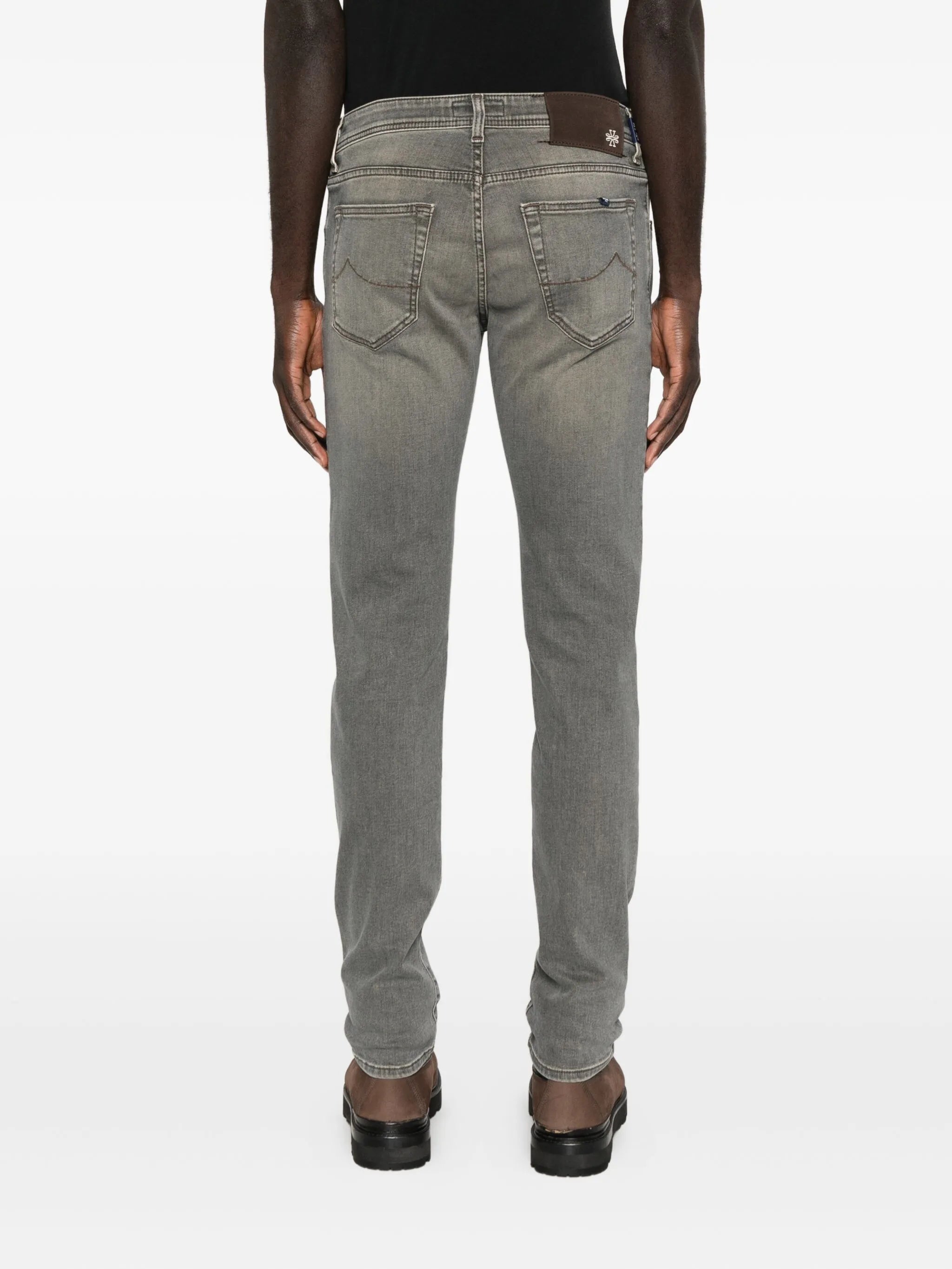 grey five-pocket styling button fly contrast stitching brown leather patch