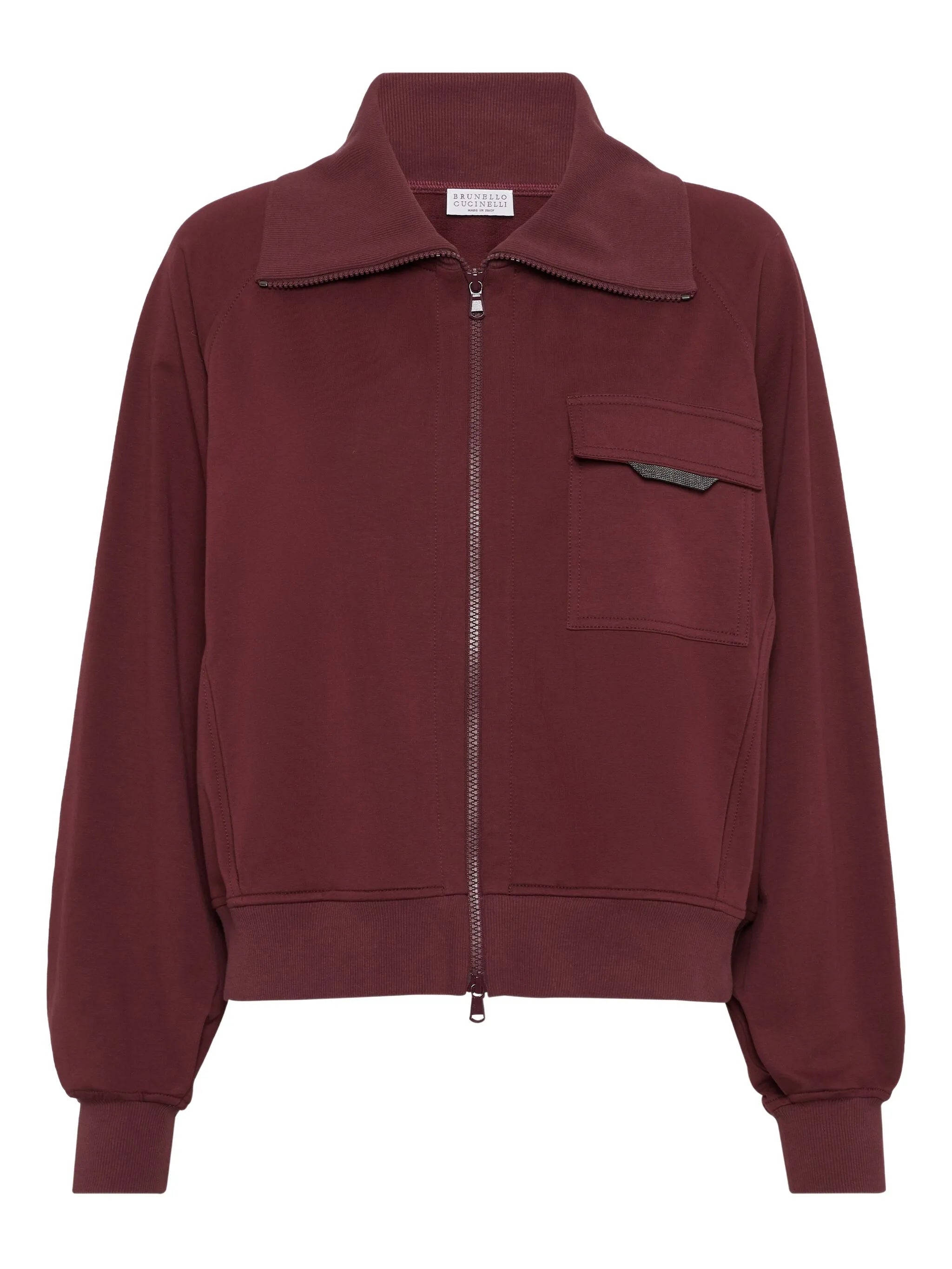 bordeaux red front two-way zip fastening chest flap pocket long sleeves ribbed cuffs and hem