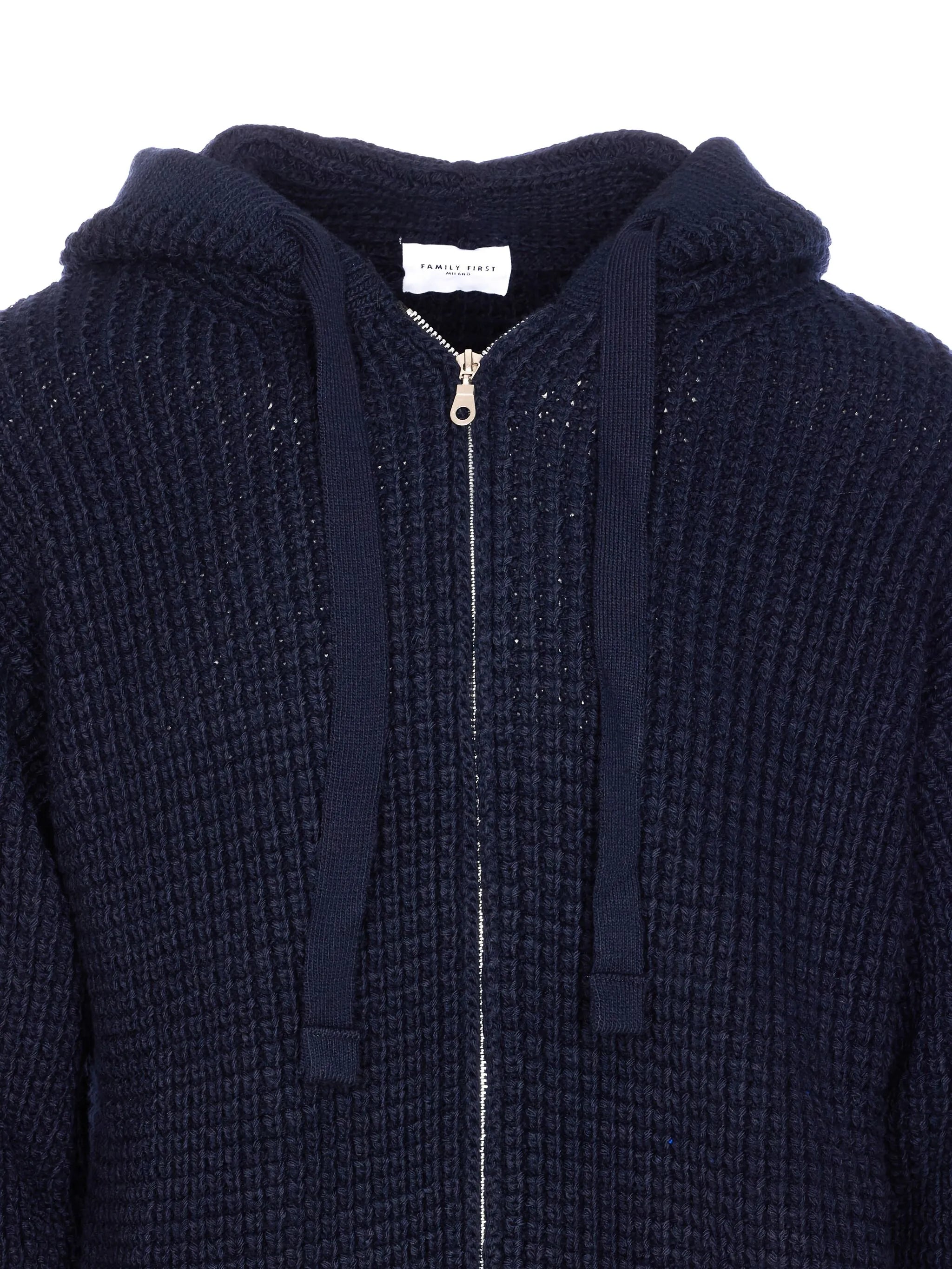 blue zip fastening hooded neck long sleeves drawstring hood ribbed hem ribbed cuffs