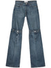 medium blue cotton denim layered design logo patch to the rear belt loops classic five pockets whiskering effect at the thighs flared design front button and zip fastening When buying this unisex item, keep in mind that it is graded in standard men's sizing.