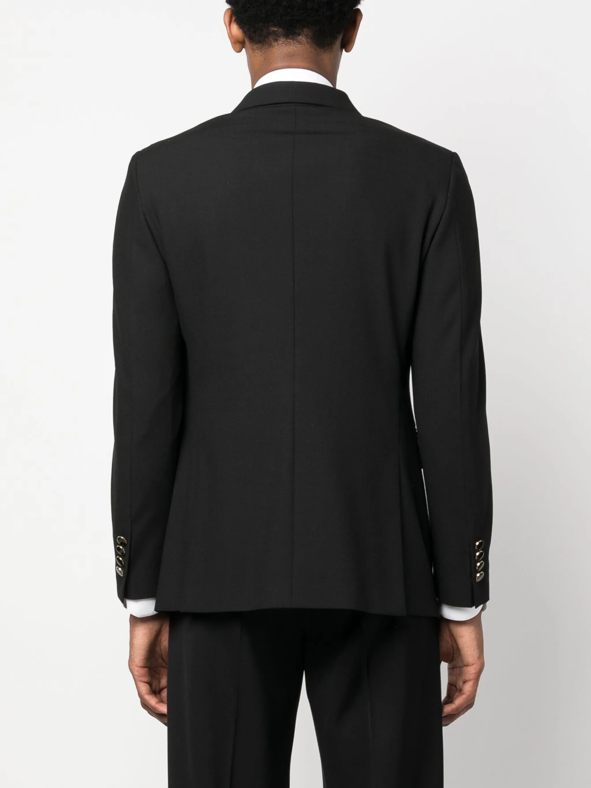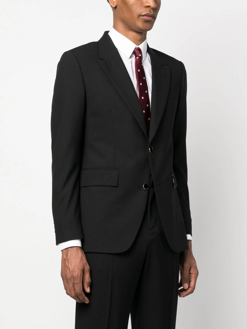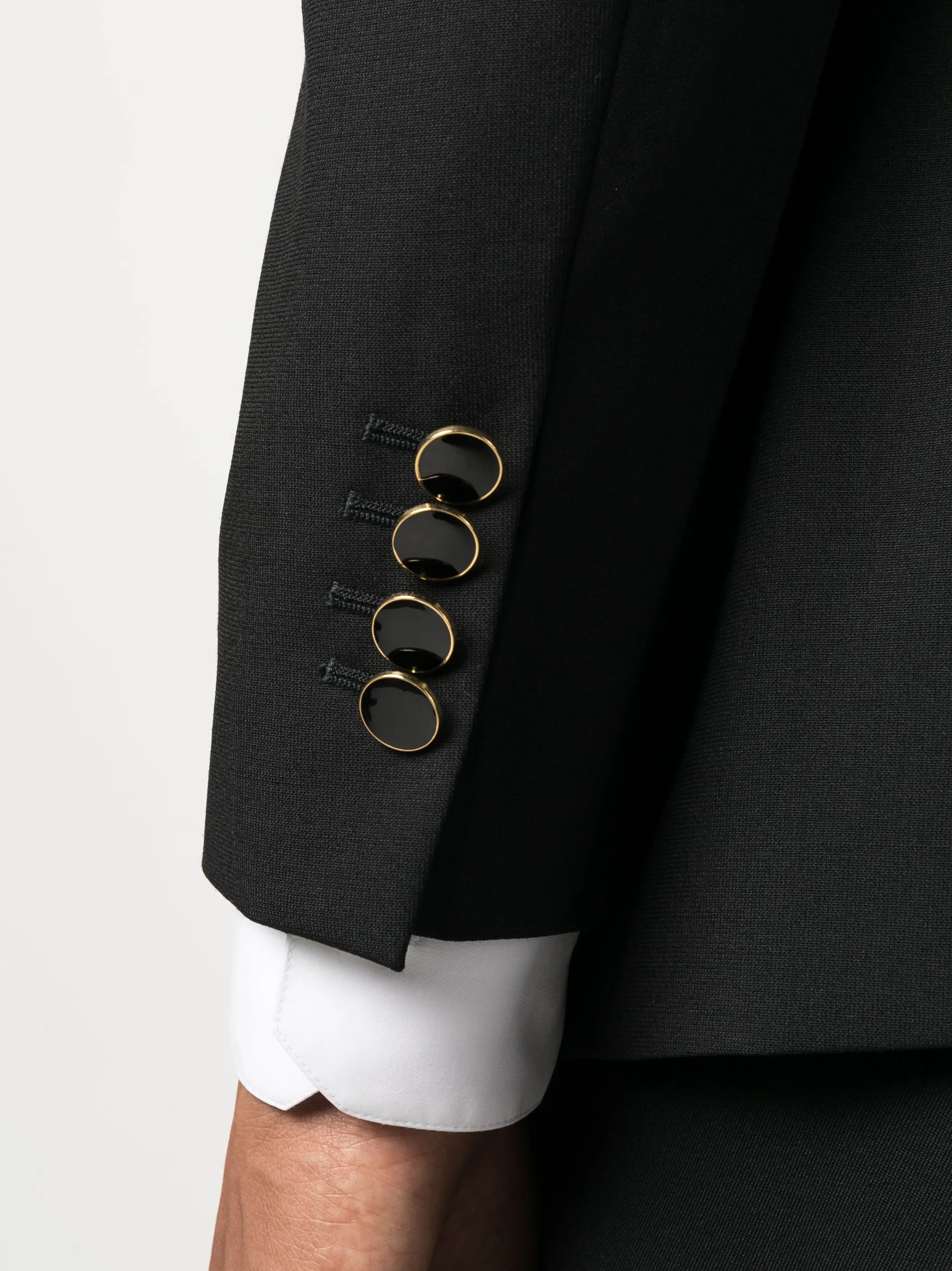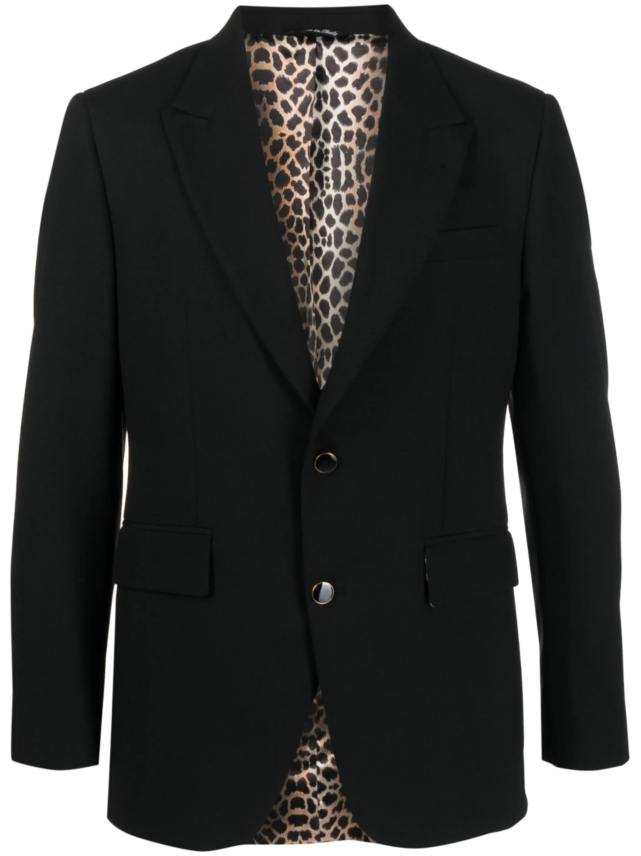 black notched lapels front button fastening long sleeves buttoned cuffs English rear vents chest welt pocket two side flap pockets leopard print lining