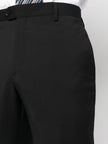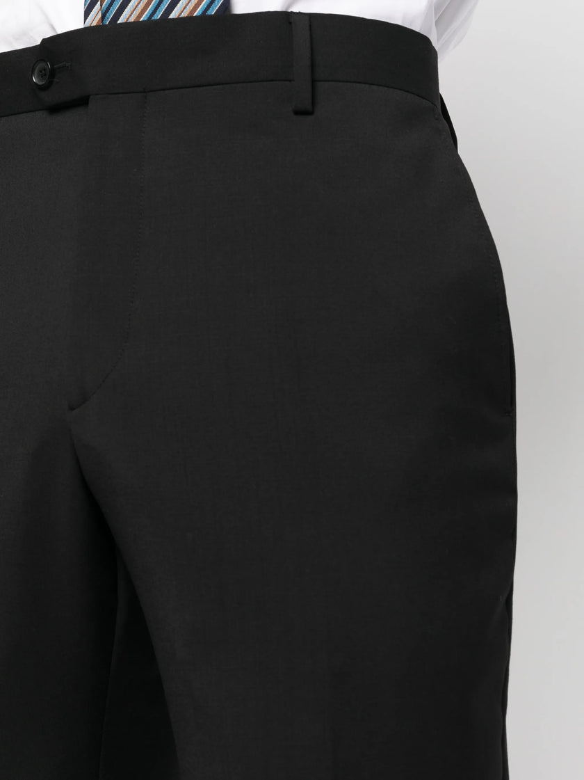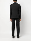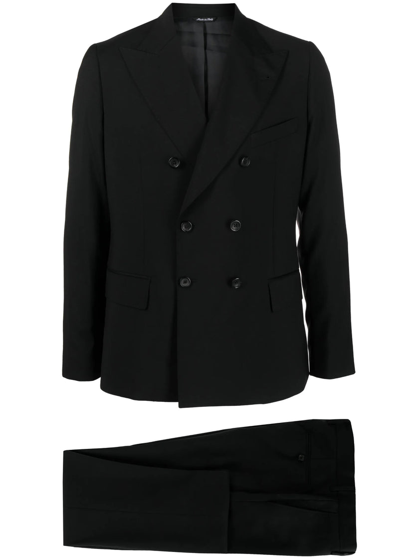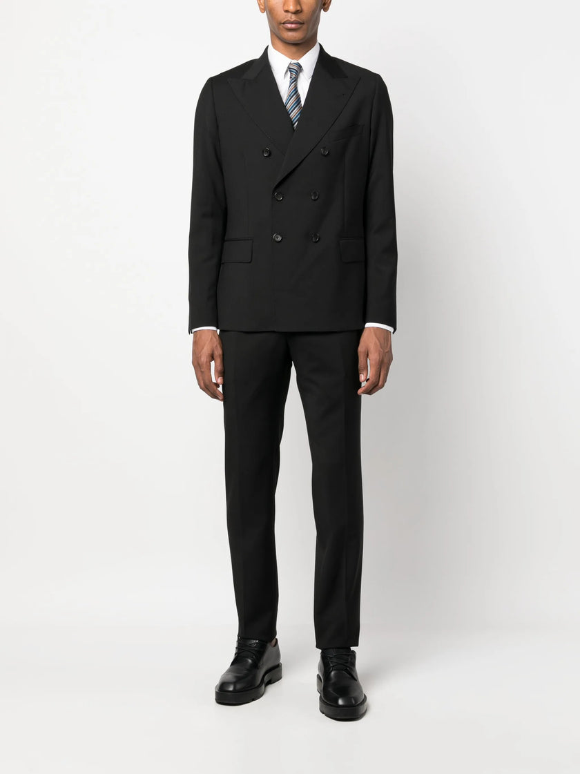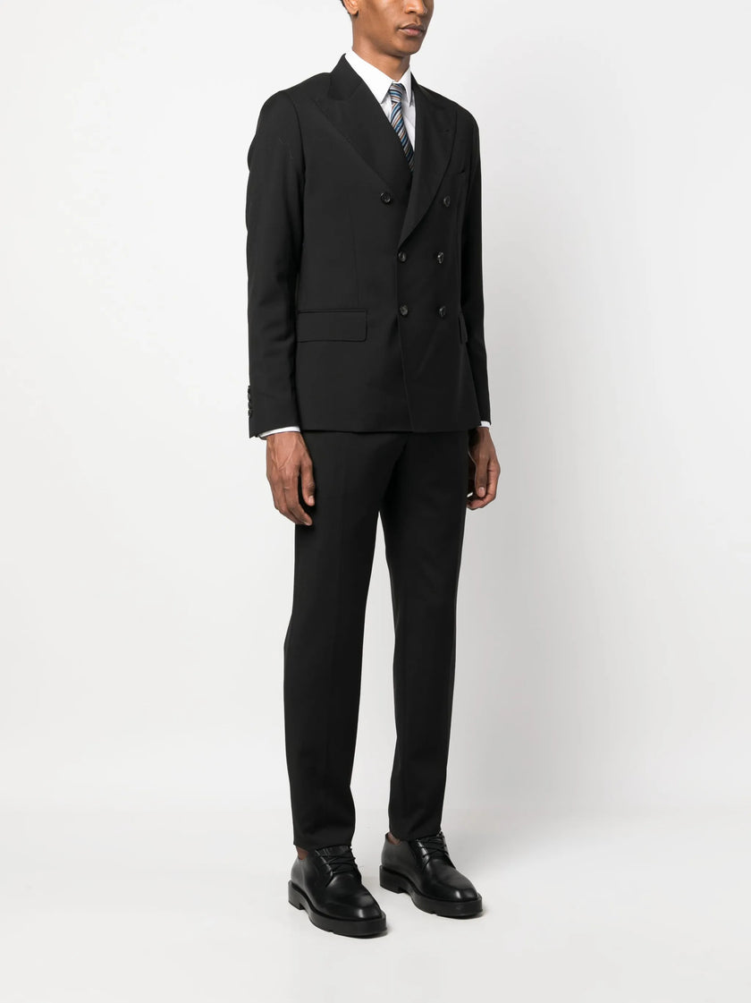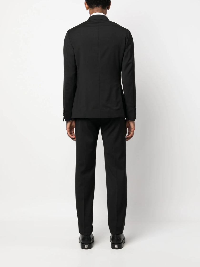 black virgin wool Jacket: peak lapels long sleeves buttoned cuffs chest welt pocket two side flap pockets Trousers: belt loops pressed crease two diagonal pockets to the sides two rear button-fastening jetted pockets