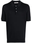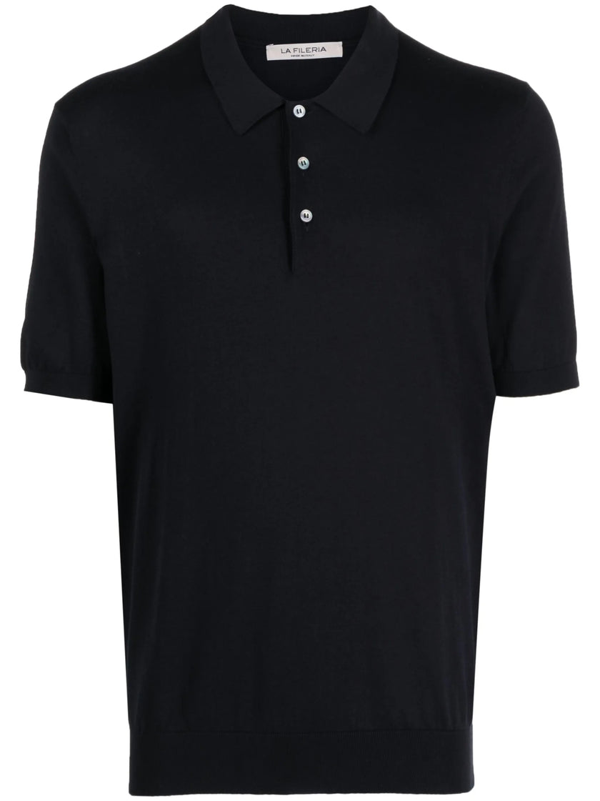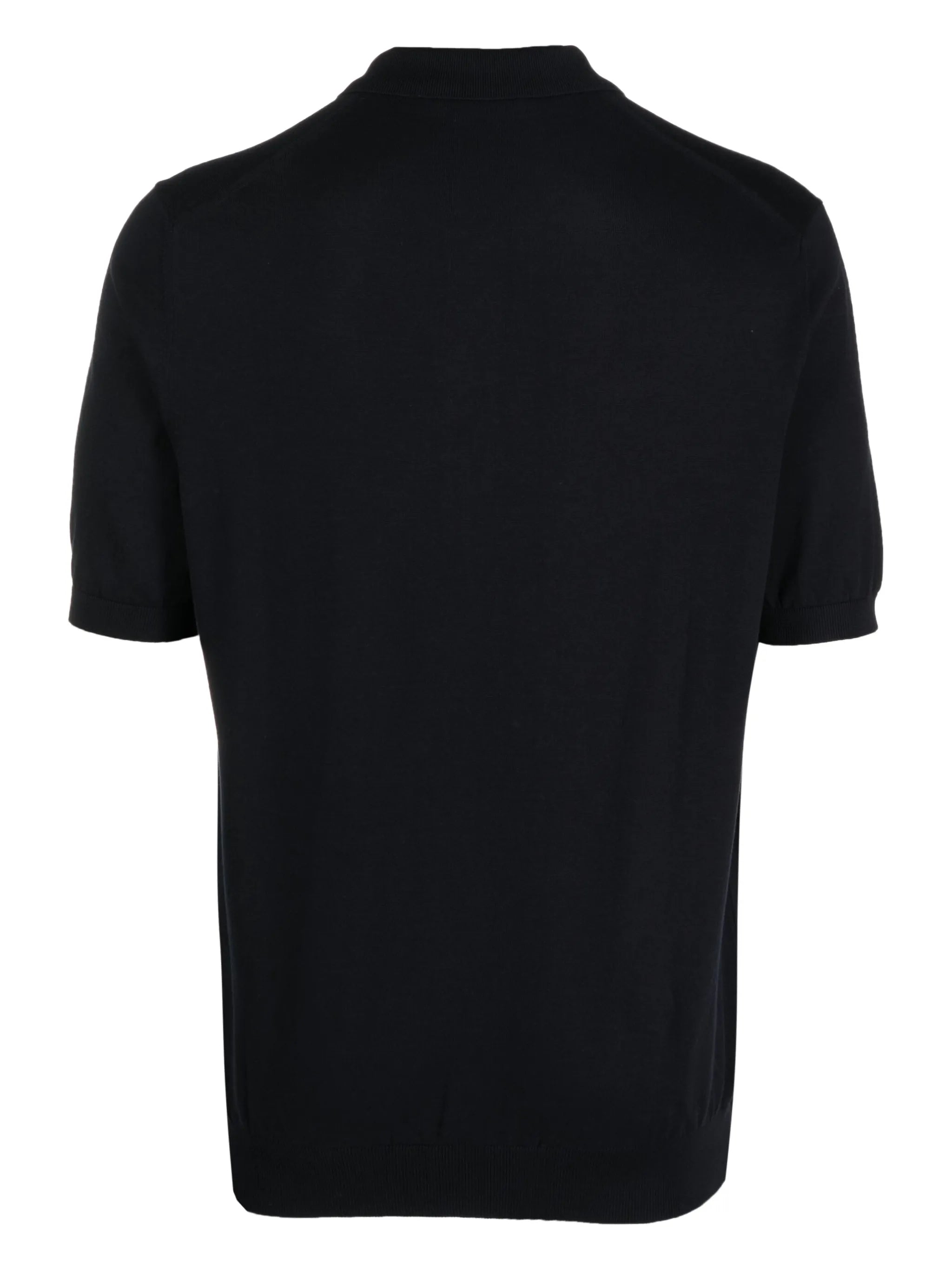 midnight blue cotton fine knit polo collar front button placket short sleeves ribbed cuffs and hem straight hem