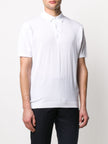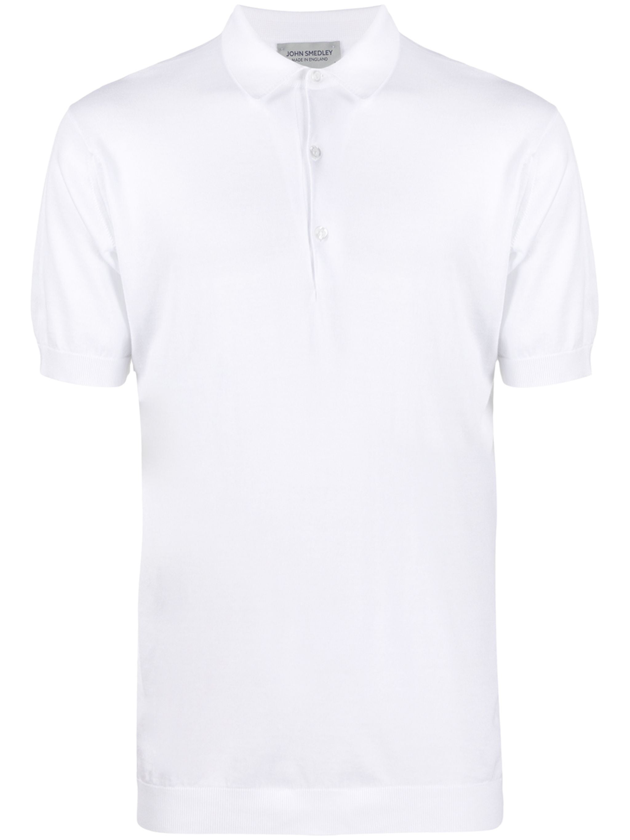 White cotton straight polo shirt from John Smedley featuring a classic polo collar, a front button placket, short sleeves and a ribbed hem and cuffs.