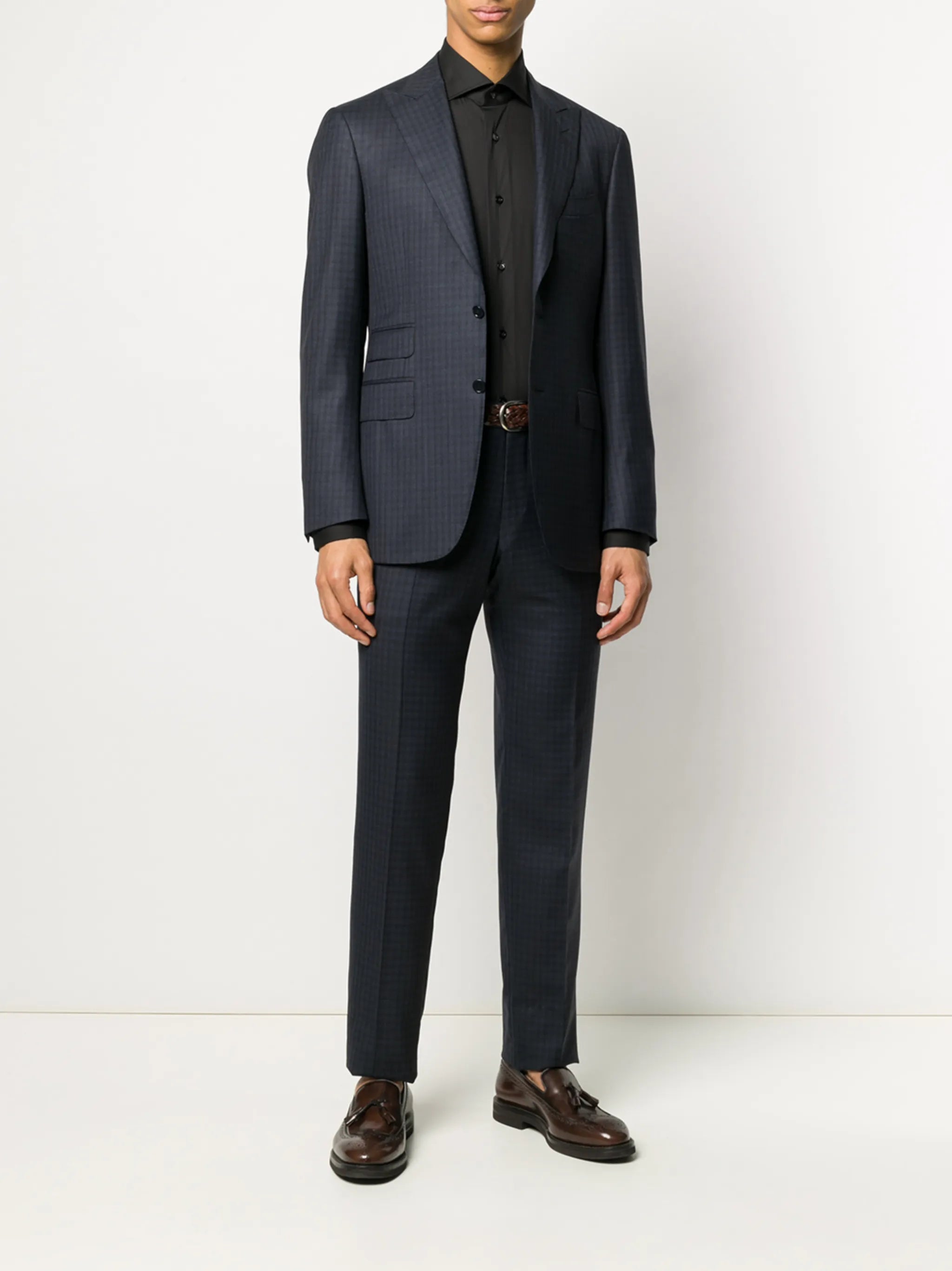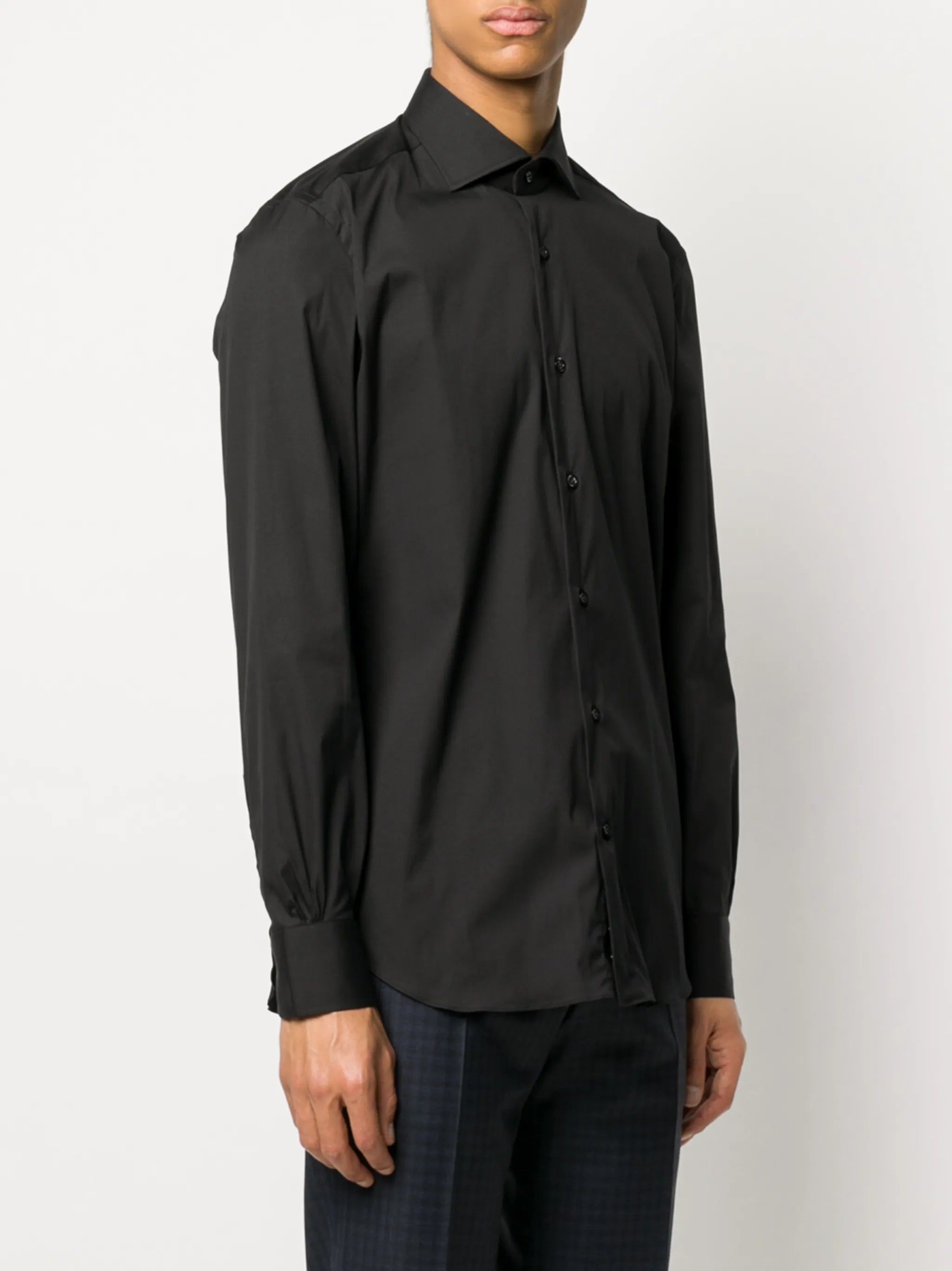 Black cotton blend fitted buttoned shirt from Mazzarelli featuring a spread collar, a front button fastening, long sleeves, button cuffs and a curved hem.