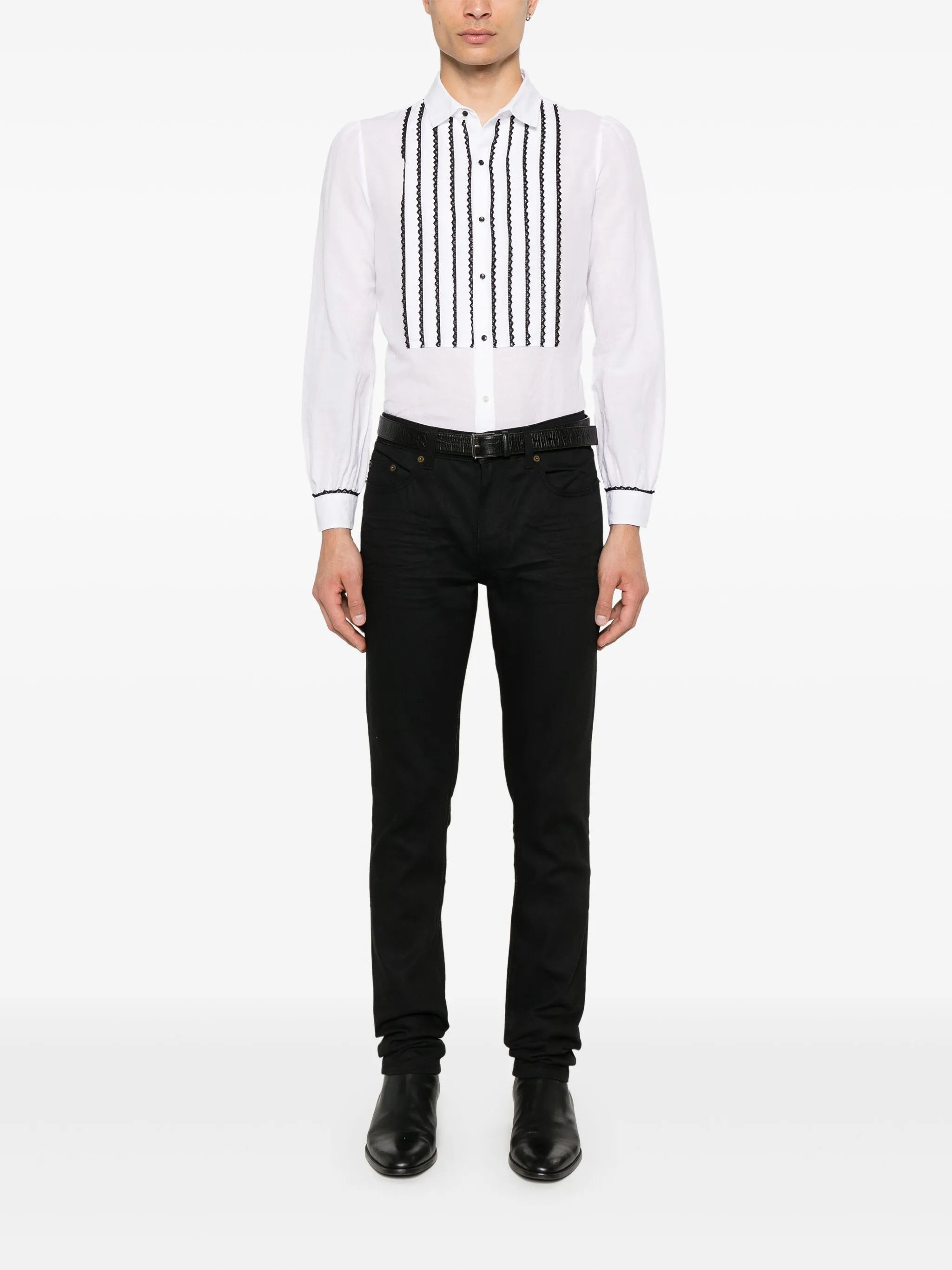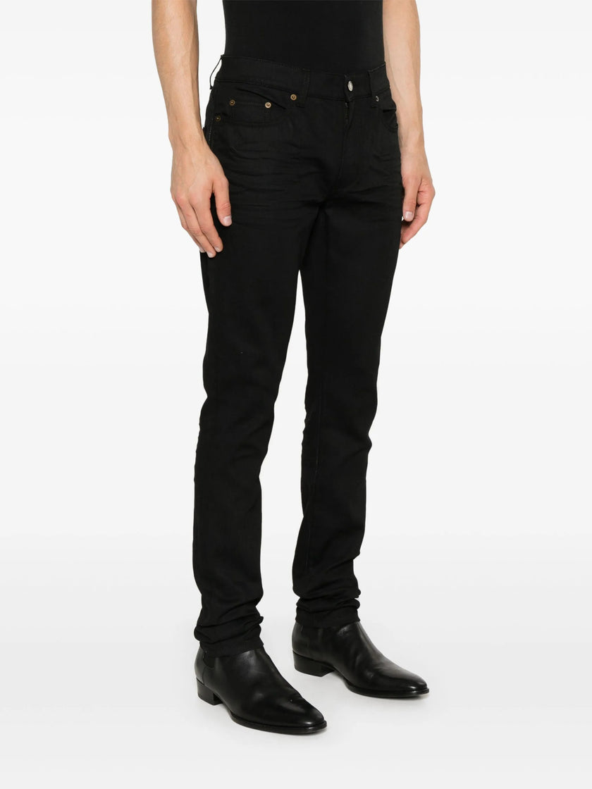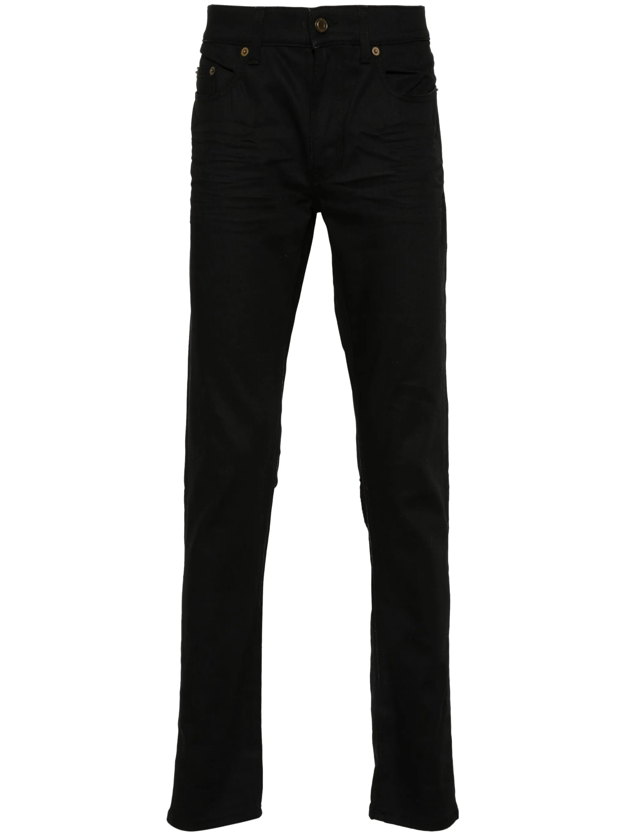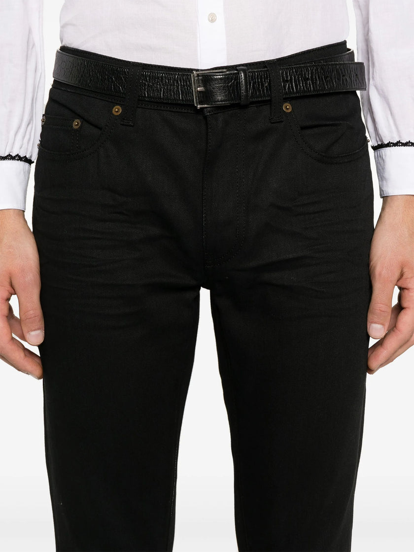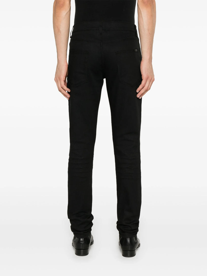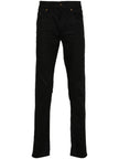 black stretch cotton black stretch-cotton denim crease effect belt loops classic five pockets appliqué logo concealed fly and button fastening